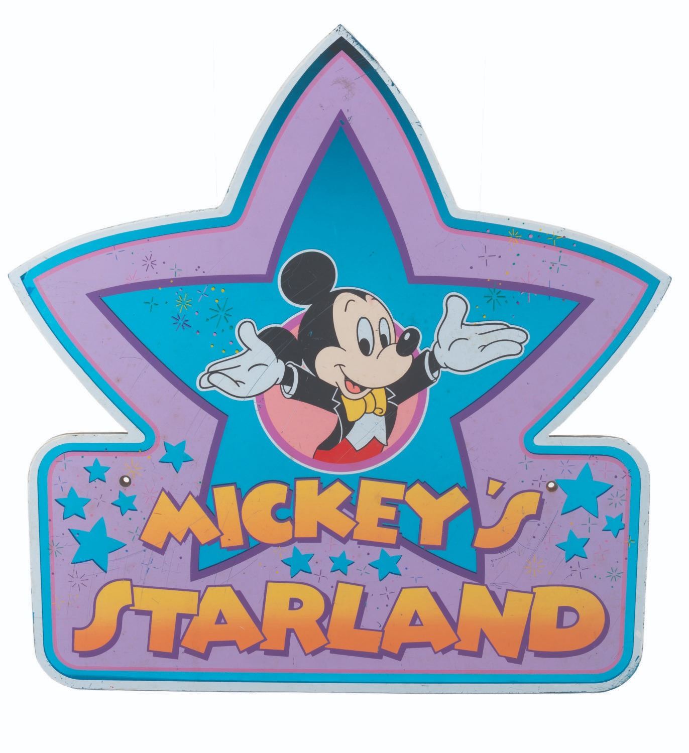 (Walt Disney World, 1990s) A lamppost sign for Mickey’s Starland in the Magic Kingdom. Originally titled Mickey’s Birthdayland in celebration of Mickey’s 60th, the land was rethemed as Mickey’s Starland and featured characters from the Disney Afternoon in a Duckburg setting. Measuring 20" x 20.75", the acrylic sign with mirrored elements is in fair condition with stains, wear, and heavy scratches throughout from Park use.