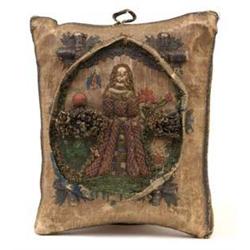 A Mid/Late 17th Century Raised Work Cushion, initialed 'EM' (?), decorated a lady within an oval frame with insects and foliage, approx 21 x 17 cm (some wear/dirt) See illustration £300-500