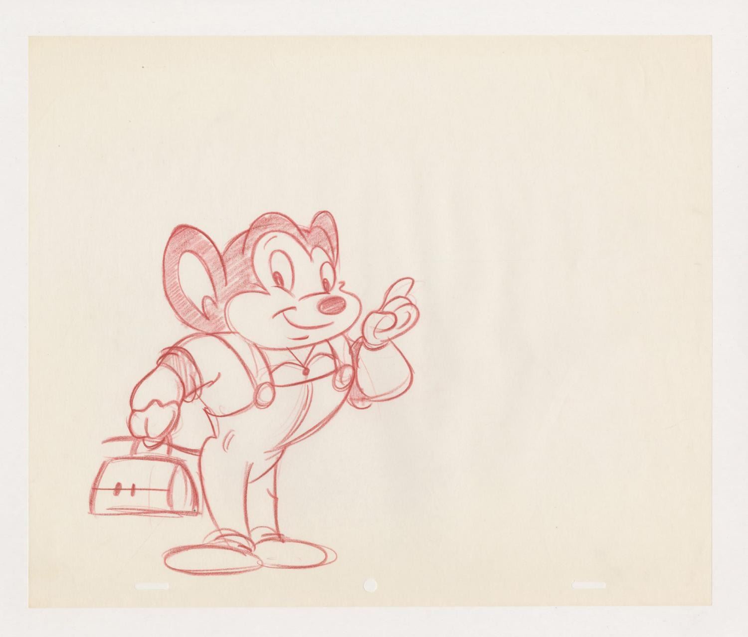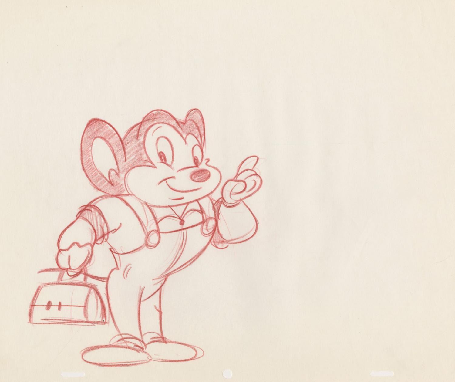 (Bakshi, 1987-88) A development drawing of Mighty Mouse from "Mighty Mouse: The New Adventures." With an image size of 6.5" x 6" on 10.5" x 12.5" animation paper, the colored pencil drawing is in very good condition with light handling wear and discoloration from age.