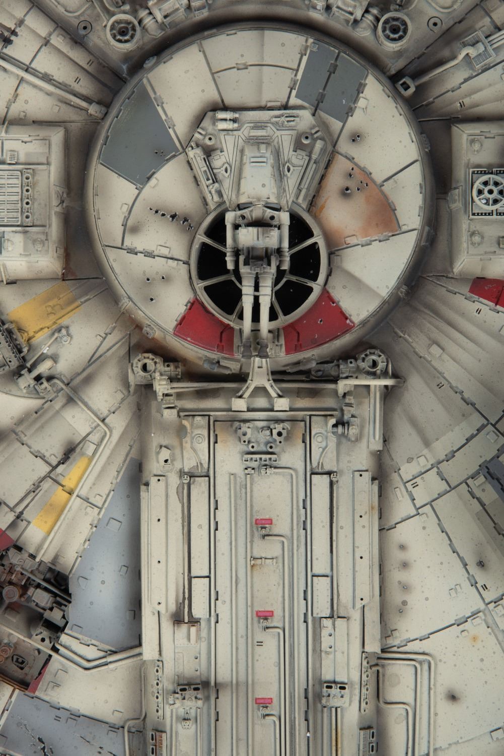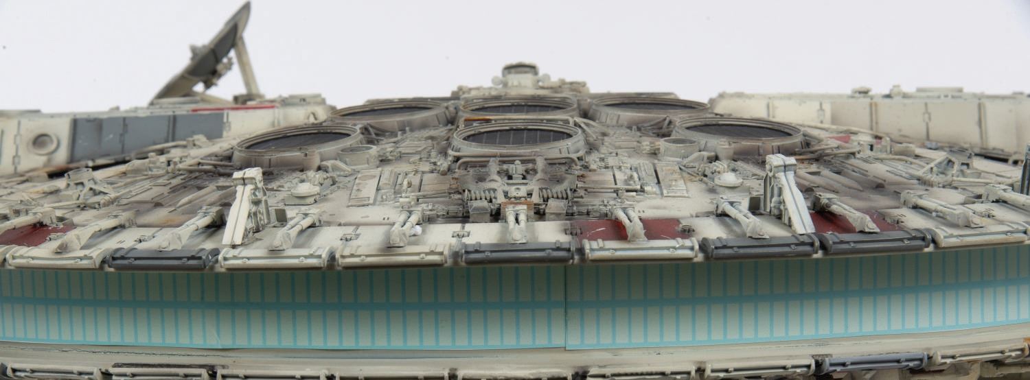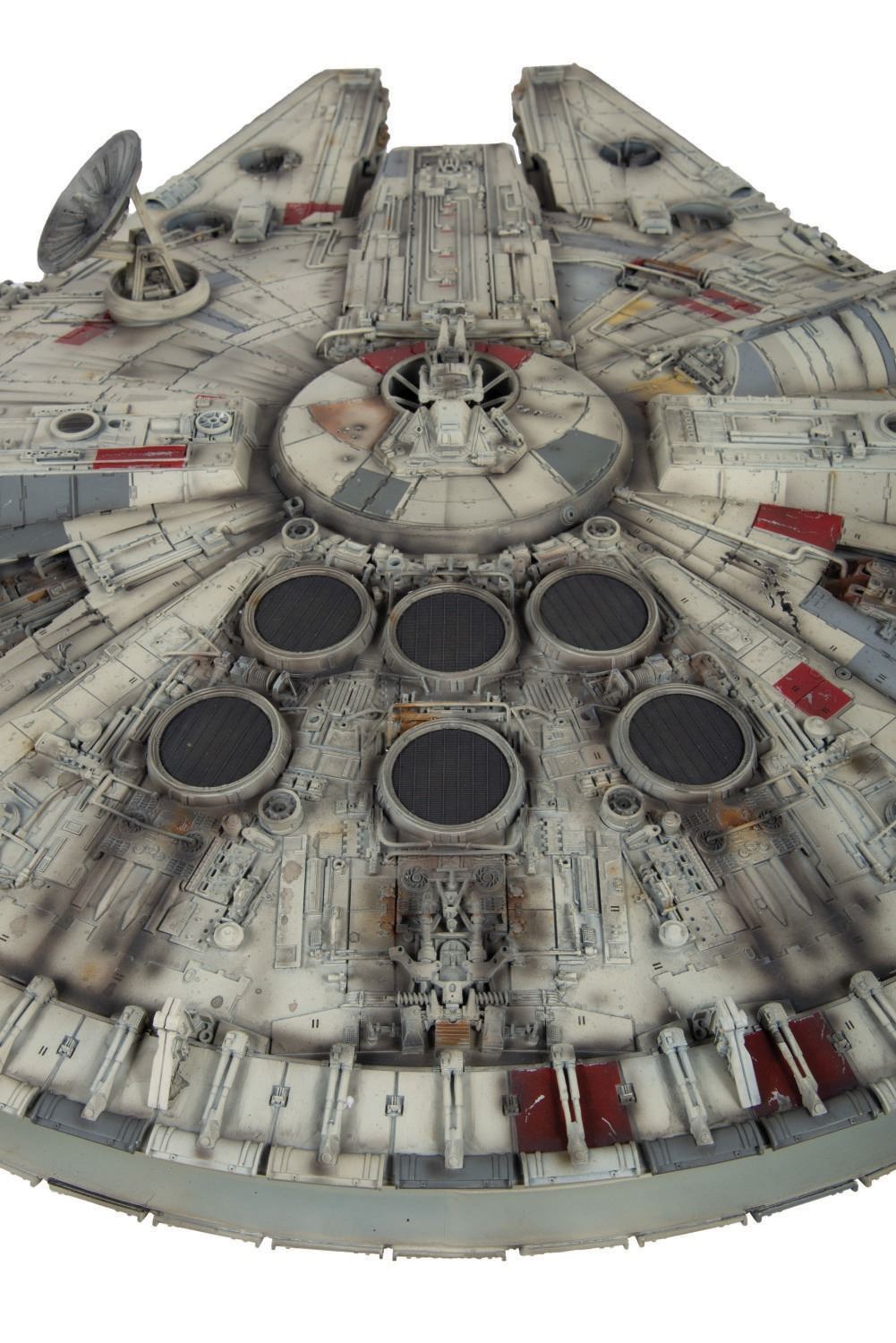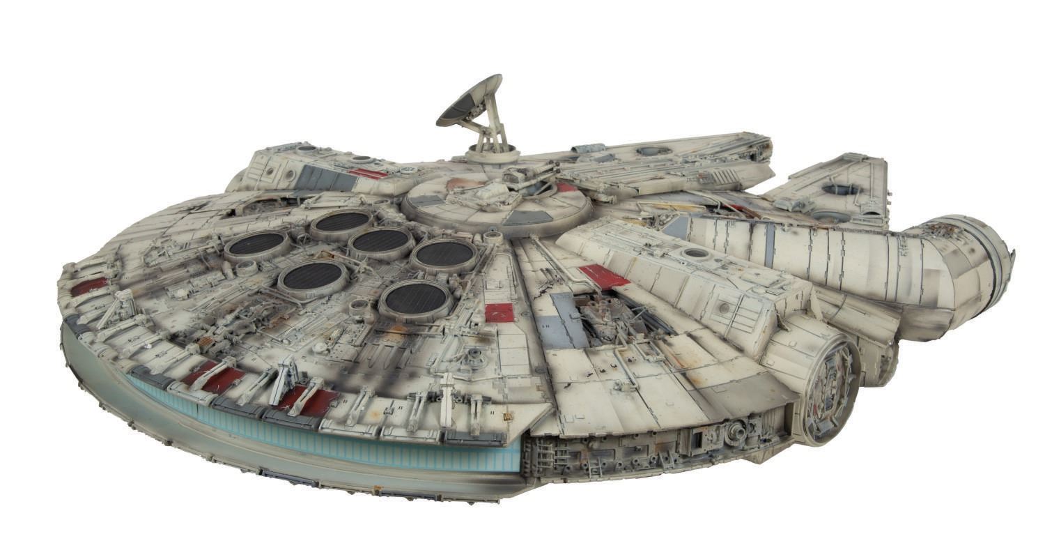 (Master Replicas, 2006) A Paint Master Prototype Model of the Master Replicas Limited Edition Millennium Falcon. This exact replica of the model used in "Star Wars: A New Hope" was detailed by Paint Master Dean Dymerski as part of the final production process. As this is a prototype, it has a unique finish that differs from the final product and does not contain the electronic illuminating features included in final assembly line models. Measuring 32"x23", the piece comes within a display case measuring 36.25"x26.25"x14.25" and is in good condition, despite a few small broken pieces to the cockpit and rear.