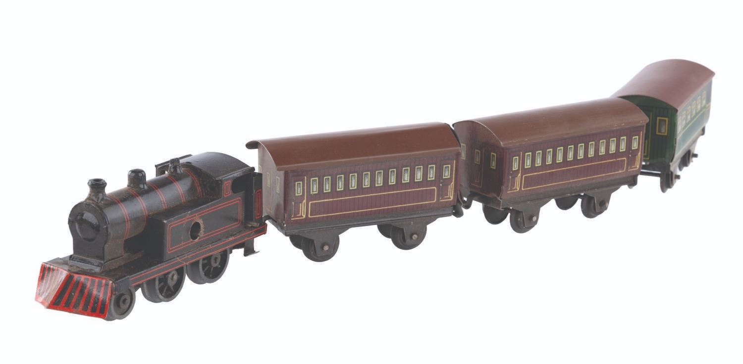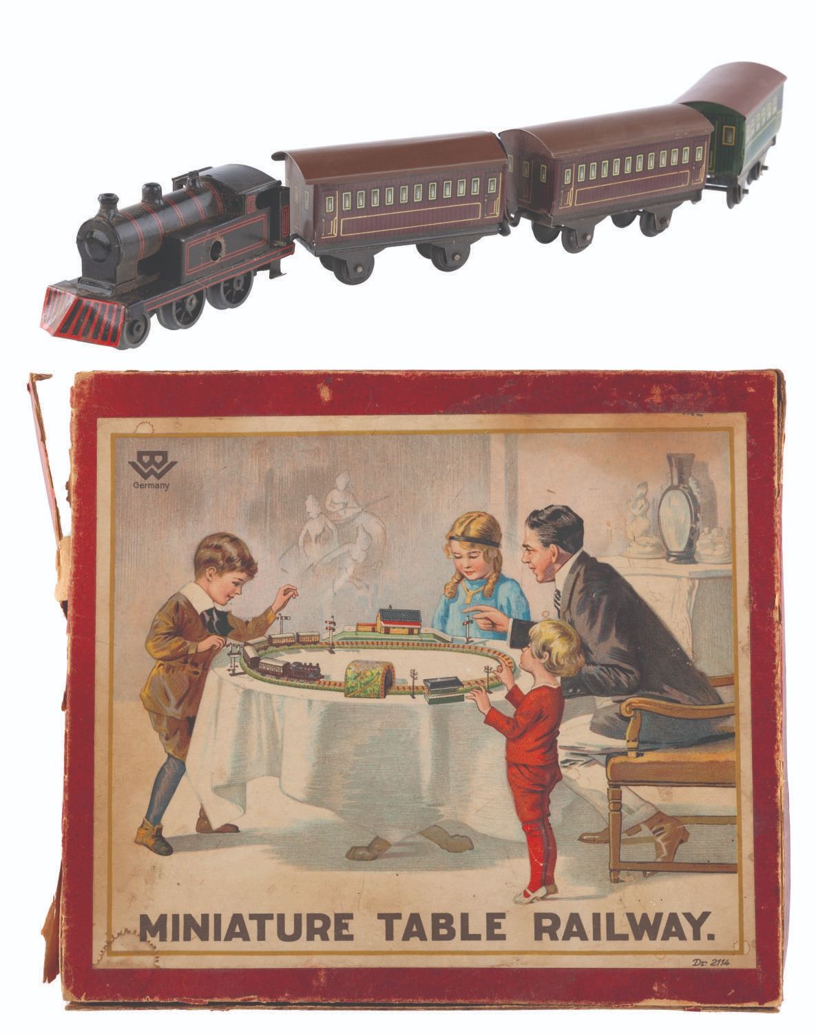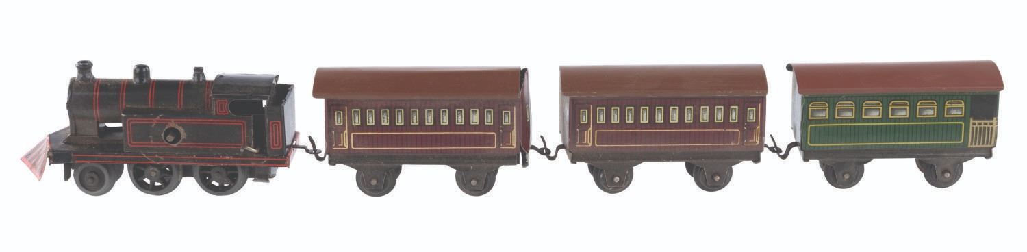 (Bing Germany, 1930s) A Miniature Table Railway tinplate clockwork OO Scale Train Set, including one LNER 2-4-0 tank locomotive, three LNER 4-wheel coaches together with tinprinted tracks, comprising of 12 curves and four straights to form an oval. The measurements for the cars are 1.25" x 3" x 1.75" tall, for the engine 1.5"x 4.5" x 2" tall, and the tracks 7" to 7.25" in length. They are in very good condition with light scuffs and light oxidation from age, in their original fair-conditioned box, measuring 8.5" x 9.5", with its lid borders separated.