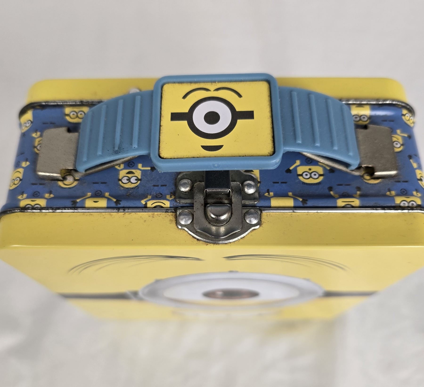 (Universal Studios) This is a tin lunch box featuring the face of Stuart the Minion. The body of the lunch box is a blue background and images of Minions. It is in good condition. It measures 5.75" x 5.75" x 2.5" and it weighs 9.5 oz.
