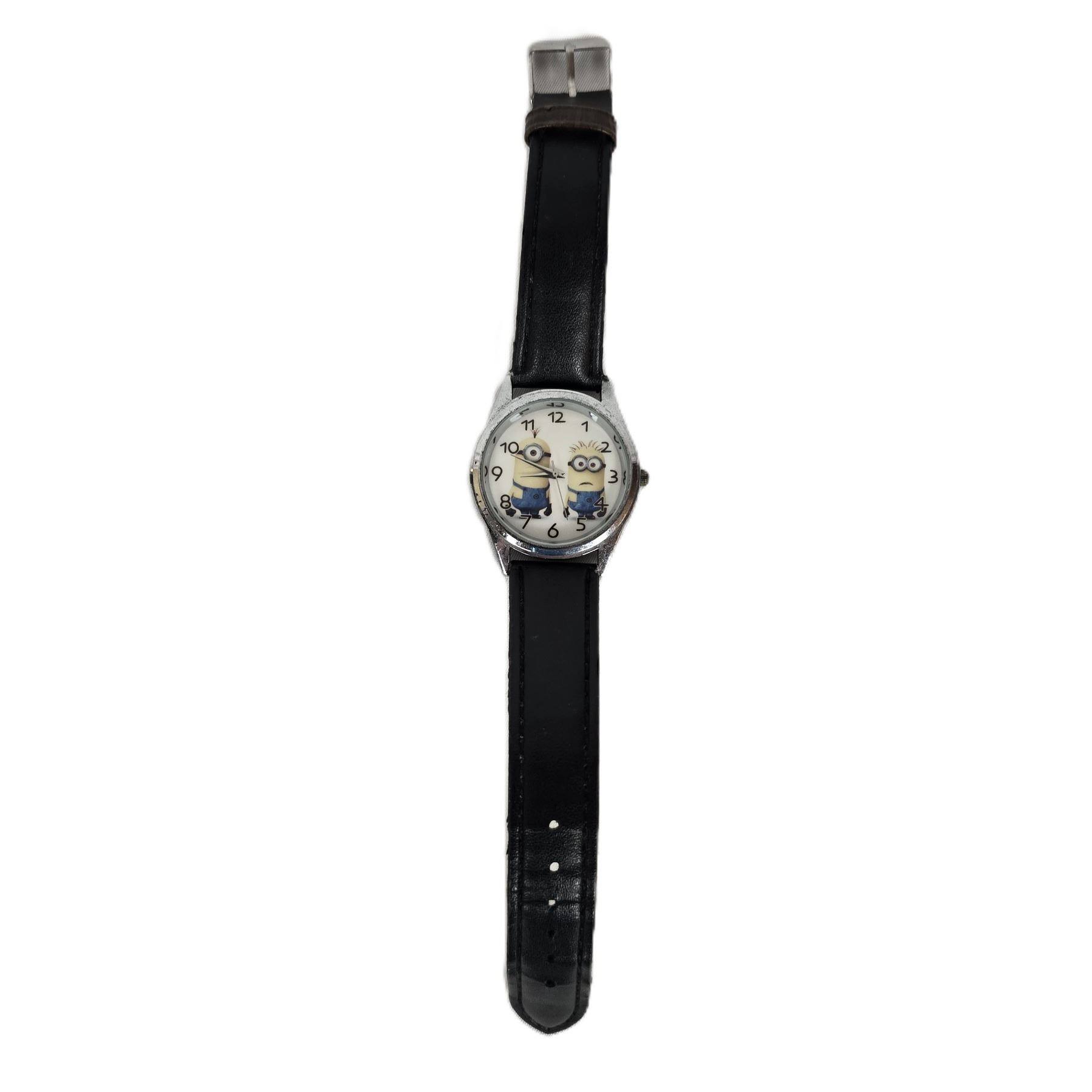 (Universal Studios) This is a silver watch with two minions on the face. It has a black band. It is in good condition. It weighs 0.8 oz.