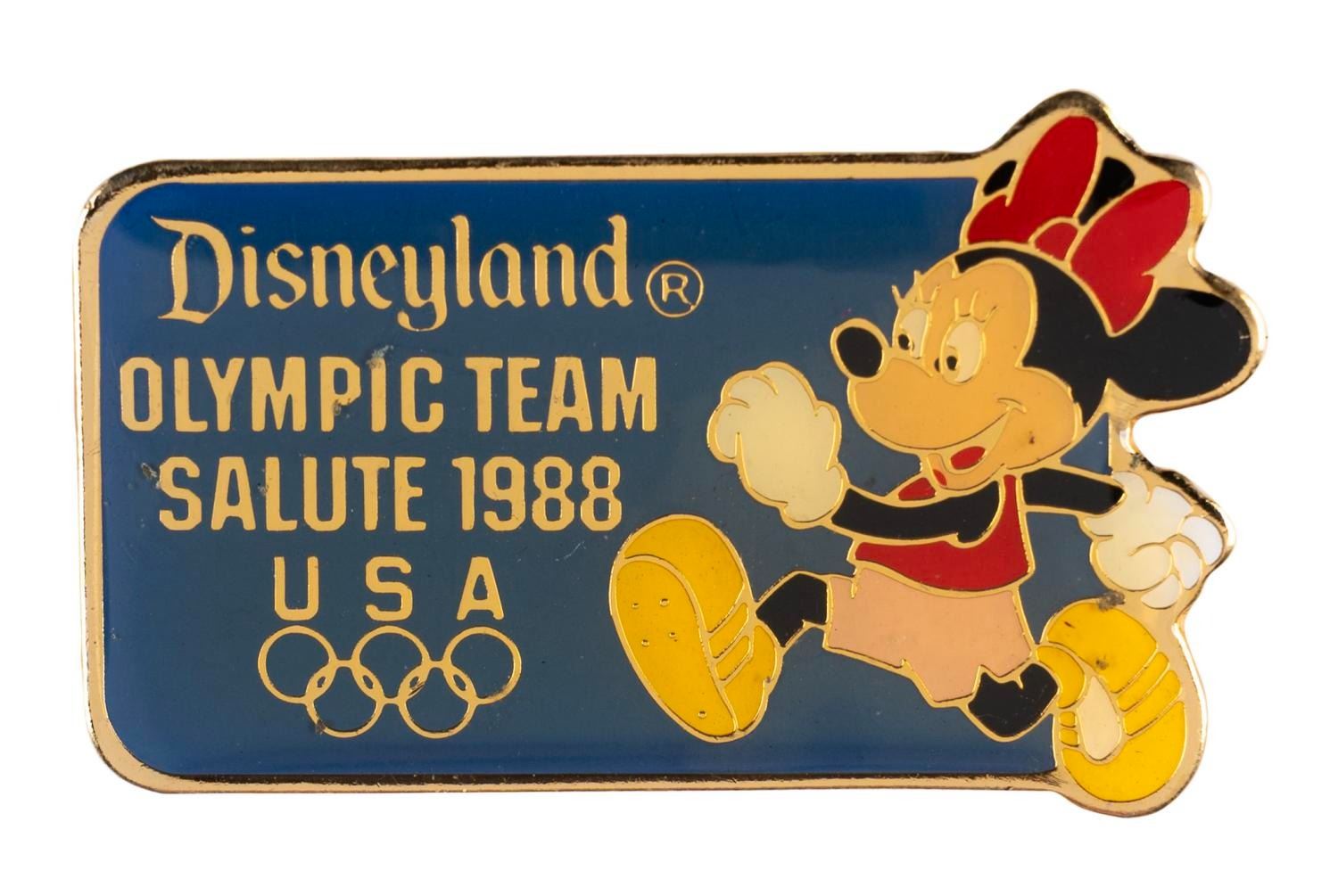 (Disneyland, 1988) A Disneyland Olympic Team Salute 1988 pin, featuring Minnie Mouse running track. Measuring 1.5” wide, the pin is in very good condition.