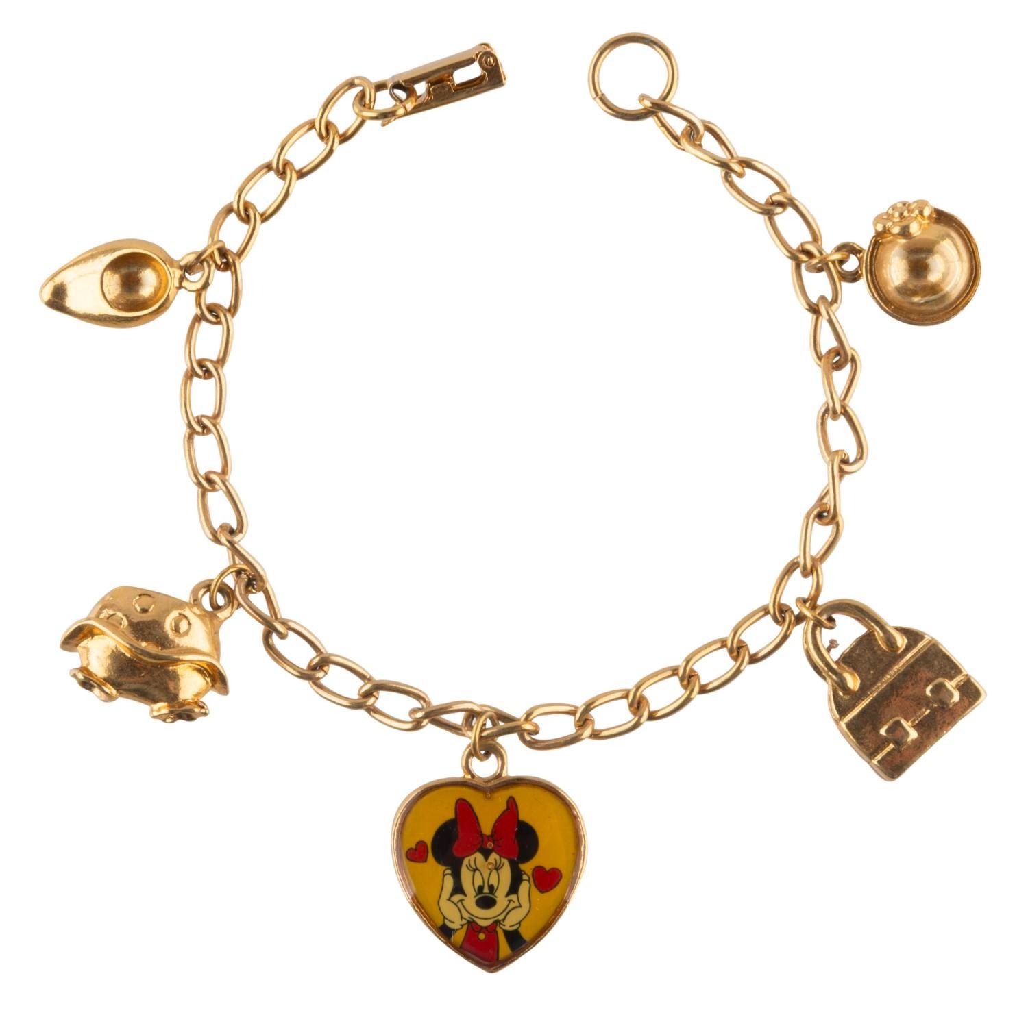 (Disney, 1980s-90s) A Minnie Mouse charm bracelet with five charms themed to Minnie and her wardrobe. Measuring 7” long the bracelet is in very good condition with light handling wear.