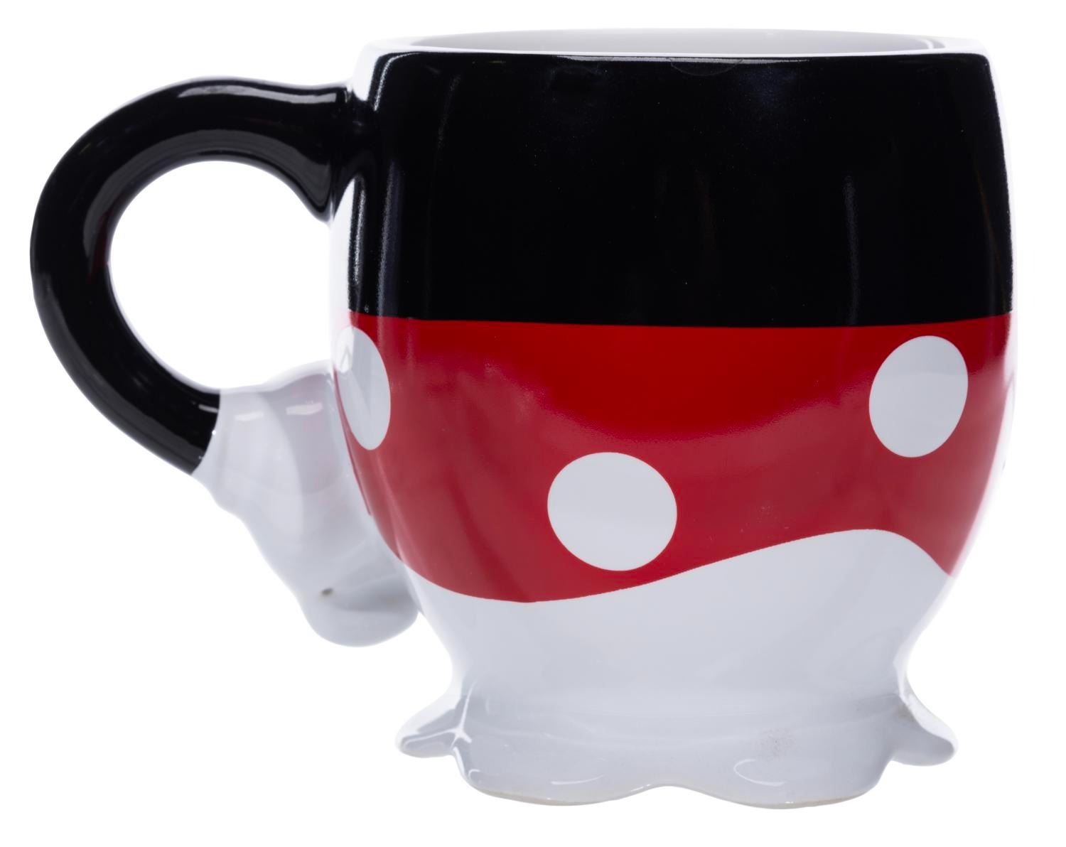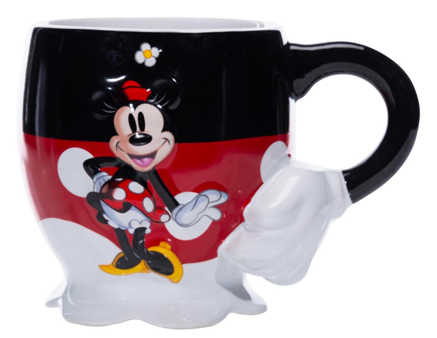 (Disney, 2000s) A Minnie Mouse coffee mug featuring a handle shaped like Minnie’s arm and hand. Measuring 3.75” in diameter and 4” tall, the mug is in very good condition with light wear.