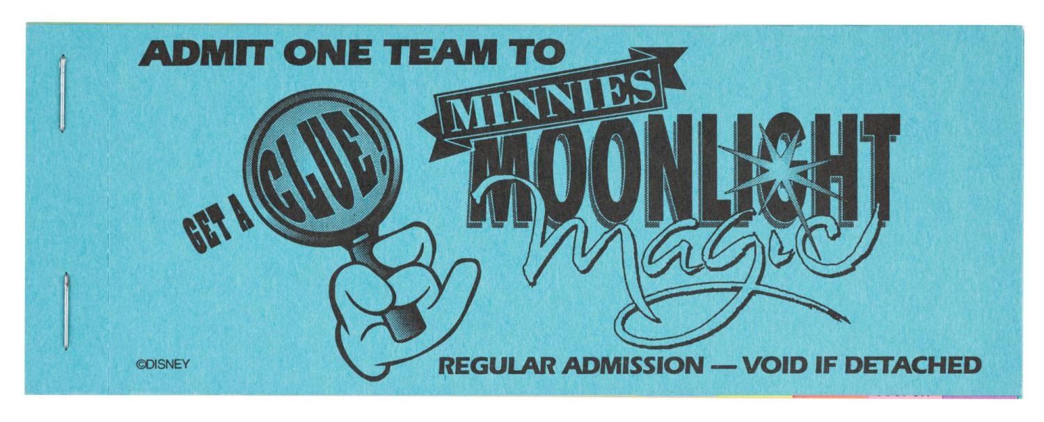 (Disneyland, 2000s) An unused ticket book from the Cast Member-exclusive Minnie’s Moonlight Magic event at Disneyland. Inside are multiple “A” through “E” tickets for various Park attractions. Measuring 2.5” x 6.5”, the ticket book is in fine condition.
