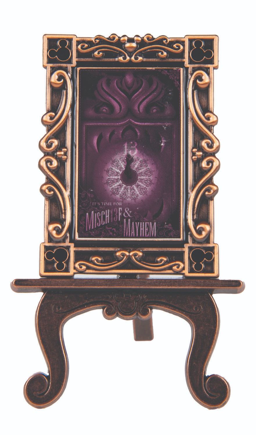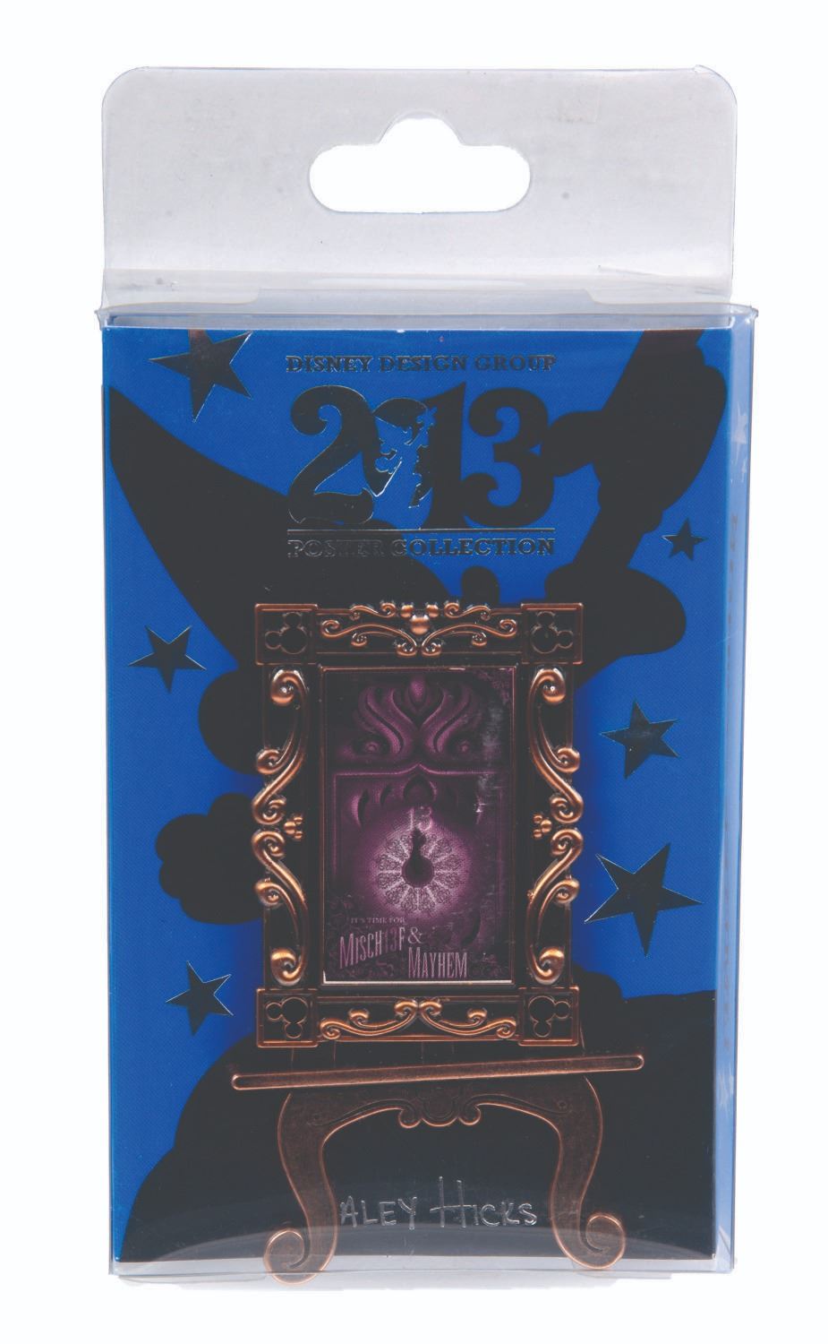 (Disney Parks, 2013) An It's Time for Mischief & Mayhem Poster Collection Pin featuring the Haunted Mansion clock on a miniature easel, as envisioned by artist Caley Hicks. Measuring 3.5" x 2", the limited edition 2000 pin set comes within the original box and is in fine as-new condition.