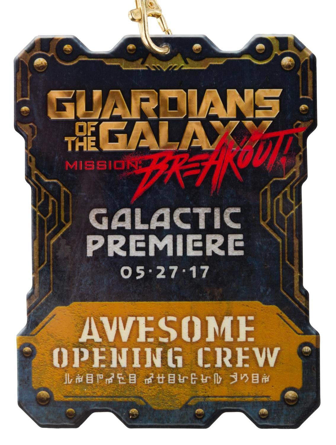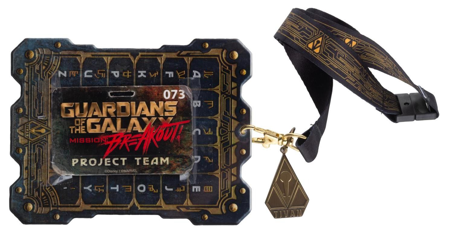 (Disney California Adventure, 2017) A Project Team I.D. card and Galactic Premiere pass for Guardians of the Galaxy Mission: Breakout! at Disney California Adventure. The pass includes a black and gold lanyard beautifully themed to the event. The pass and lanyard are in very good condition, with the Project Team card in good condition with wear to the laminate from use, and taped to the pass.