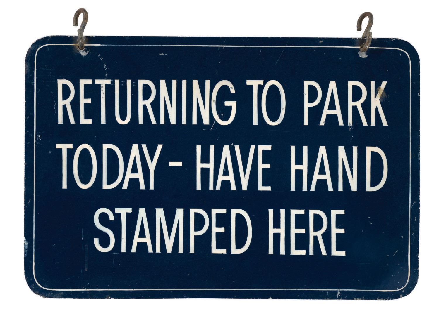 (Disneyland, 1960s) A Monorail Station Exit & Hand Stamp Sign. The vintage 1960s double-sided sign was displayed near the exit queue of the Monorail at either the Tomorrowland or the Disneyland Hotel Station and reminded Guests to stamp their hands for return to the Park. The hand-painted sign was created by the Pictorial and Sign Department in the Staff Shoop at Disneyland. Measuring 21.25"x14", the metallic sign is in good condition with chips to paint, scuffs, oxidation, and wear throughout from display, handling, and age.