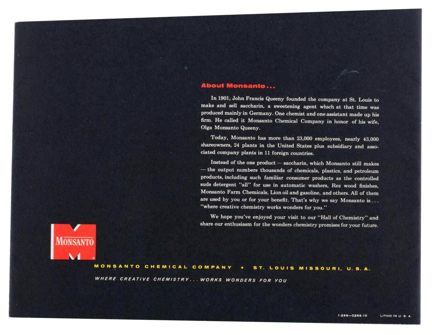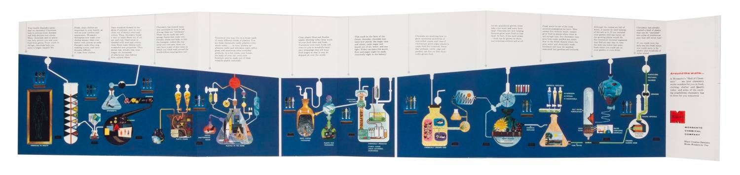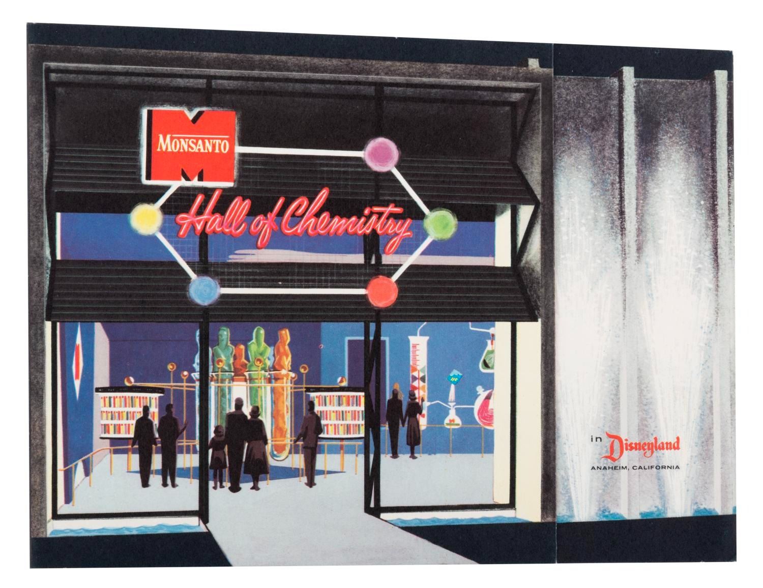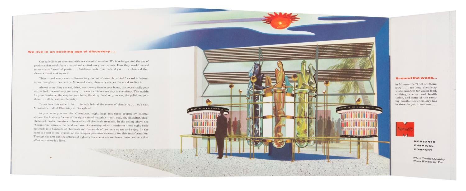 (Disneyland, 1955) An early souvenir brochure from the Monsanto Hall of Chemistry exhibit in Tomorrowland. The brochure opens to reveal gorgeous full-color illustrations and tells the story of "the enormous contribution of chemistry to the world around us." Measuring 7.25" x 9.5", the brochure is in very good condition with light handling wear and spots of discoloration on the reverse.