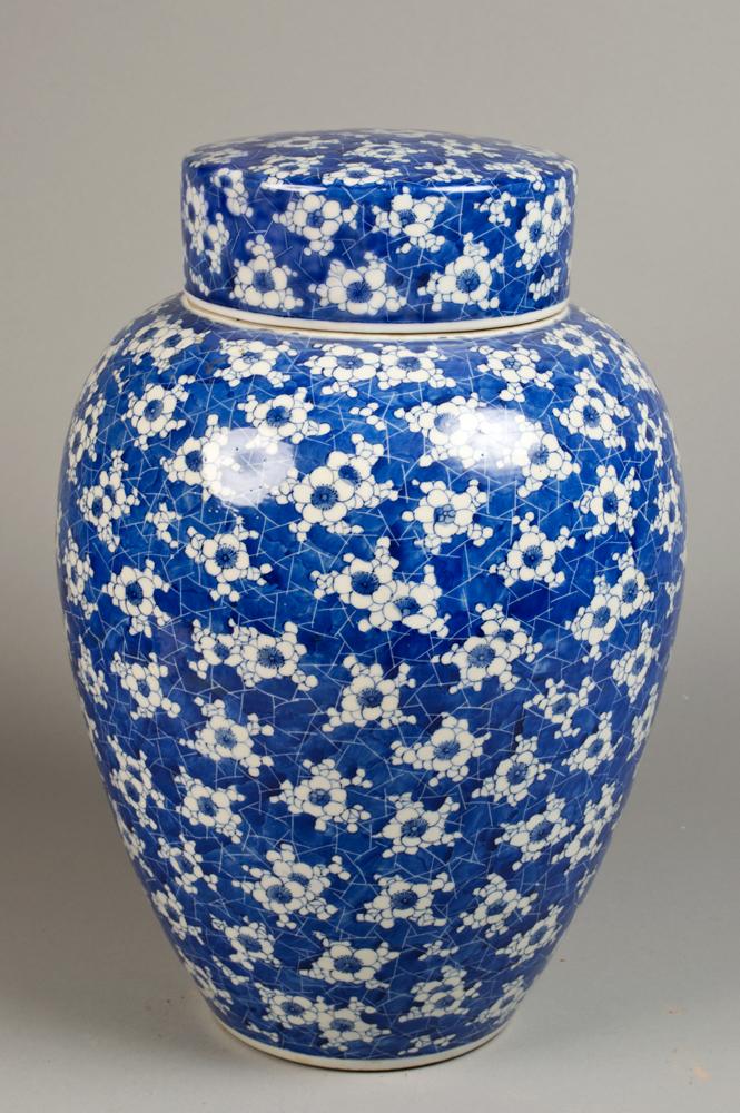 A Fine Chinese porcelain vase and cover with lotus against a blue ground, unsigned, 18.5"H, circa 19th century.