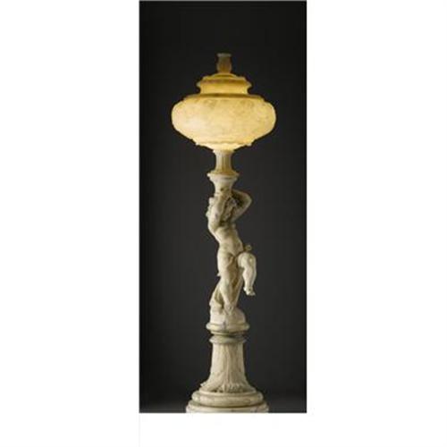 <B>A Monumental Italian Alabaster Figural Torchiere</B></I><BR><BR>Italian<BR>Late Nineteenth Century<BR>Alabaster<BR>Marks: signature effaced, and numbered <I>73 / No. 382/390 / s</B></I><BR>75 in. high<BR><BR>The torchiere with a relief carved dome adorned with an expertly executed chain of dancing putto all supported on the head of a cherub balanced on one leg, above a round base adorned with acanthus leaves1 <BR><BR><B>Condition Report:</B> Normal signs of wear as appropriate with age and some scratches