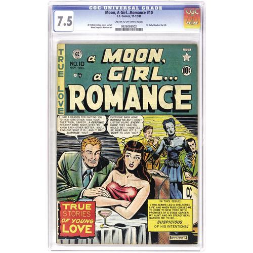 <B>A Moon, A Girl... Romance #10 (EC, 1949) CGC VF- 7.5 Cream to off-white pages.</B></I> Wally Wood's first art for EC was not a sci-fi or horror yarn, but rather this issue's romance tale "I Thought I Loved My Boss," on which he collaborated with Harry Harrison. The issue also has art by Graham Ingels and of course Al Feldstein, illustrating the cover story with the familiar romance-mag theme "what's he after, marriage or hanky-panky?" The book's called "scarce" by Gerber, and this is the first copy we've ever offered. Overstreet 2006 VF 8.0 value = $363. CGC census 5/06: 2 in 7.5, 1 higher. <BR><BR><B>Important notice:</B> Heritage usually auctions material at the rate of 200-250 lots per hour. On some occasions eBay Live bid software or the Internet may not be able to keep up with the pace of the auction. We recommend placing a realistic absentee bid now as insurance to avoid disappointment. Occasionally the auctioneer may eliminate or reject an eBay Live bid, and the auctioneer may also reopen a lot after the close of the eBay live bidding (usually because we missed an audience bid), and may reject your bid even if it shows you as the winning bidder. By bidding via eBay Live, you agree that Heritage may award the lot to another bidder at its sole discretion under the circumstances described above or any other reasonable circumstances. Since eBay bids are not shown to us until we open the lot on the floor, we treat those bids just like floor bids. In most cases the floor responds before the eBay bid is presented to us, due to Internet lag time, so for consistency we have made it a policy that floor bids are always considered first over tie eBay live bids. Also please note that all Heritage lots purchased through eBay Live carry a 22.5% Buyer's Premium. Please make sure you read the Terms and Conditions before you bid. This lot is being auctioned in conjunction with a live floor auction by Heritage Auction Galleries. All final auction and invoice information will be supplied by Heritage Auction Galleries, and all other information should be considered preliminary. Lot:41001 <BR><BR><B>Winning Notification and Billing:</B> After the FINAL session in this auction is complete, Heritage will send e-mail and snail mail invoices. This process normally takes several days. All final auction and invoice information will be supplied by Heritage Auction Galleries, and all other information should be considered preliminary. <BR><BR>This auction will be conducted on a live auction floor and over the Internet through eBay Live. If you choose to place an absentee bid, please take a moment to <font color='#0000ff'><u><a href='http://pages.ebay.com/liveauctions/help/before/laabsentee.html'>learn how eBay Live absentee bidding works</a></u></font><font color='#000000'>