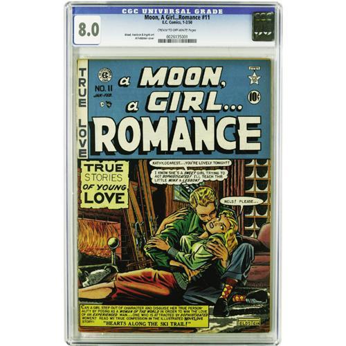 <B>A Moon, A Girl... Romance #11 (EC, 1950) CGC VF 8.0 Cream to off-white pages.</B></I> Every EC fan knows <I>about</B></I> this Pre-Trend title, but actually getting your hands on a copy is another matter altogether! This is one of only three that CGC has certified to date. Since postal regulations made it expensive to launch a new comic title, publishers always gave their best shot at re-using titles, thus this series was the continuation of superheroine mag <B>Moon Girl</B></I>. Among the highlights is a story by the last artist you'd expect to draw a romance tale, <I>Graham Ingels</B></I>! There's also a "NoveLove" story drawn by the Wally Wood/Harry Harrison team (featuring the cad you see on Al Feldstein's cover), a story drawn by the seldom-used Walter Johnson, and a tale called "Office Romance" by an artist no one seems able to identify! And our offering is a nice VF copy, to boot. A comic, a grade ... romance! Overstreet 2006 VF 8.0 value = $363. CGC census 03/06: 1 in 8.0, 1 higher.