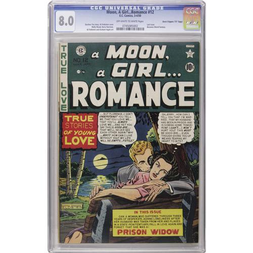 <B>A Moon, A Girl...Romance #12 Davis Crippen ("D" Copy) pedigree (EC, 1950) CGC VF 8.0 Off-white to white pages.</B></I> Called "scarce" by both Overstreet and Gerber, this last issue of the title is a pain to find. It's got an Al Feldstein cover, with interior art by Feldstein, Graham Ingels, and the Harry Harrison/Wally Wood team, plus a story by an unknown hand from the Jerry Iger shop. Overstreet 2006 VF 8.0 value = $444. CGC census 10/06: 1 in 8.0, 1 higher. <I>From the Crippen Collection.</B></I><BR><BR><b>Shipping:</b> Slabbed Comic (<a target="_blank" href="http://www.heritageauctions.com/common/shipping.php">view shipping information</a>)