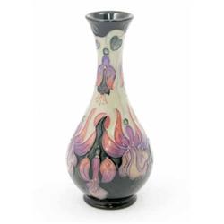 A Moorcroft Collectors Club Fuschia vase, decorated in shades of purple and pink against a two-to...