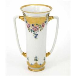 A Moorcroft Macintyre 'Eighteenth century' two-handled trumpet vase, circa 1908, decorated with swags of roses and forget-me-nots in shades of blue, green and pink, embellished with gilding, painted signature and printed mark, 8.75ins £1,500-2,000