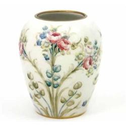 A Moorcroft Macintyre ovoid vase, circa 1907, decorated with sprays of roses, tulips and forget-me-nots against a cream ground with gilt rim and base, painted signature and printed mark, (rim with some restoration) 5.25ins £400-600