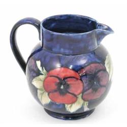 A Moorcroft Pansy Jug, circa 1930, decorated with an encircling pattern in shades of pink, purple and green on a dark blue ground, painted signature and impressed marks, 7ins £600-800