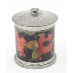 A Moorcroft for Liberty Tudric tobacco jar, circa 1920, decorated in Pomegranate pattern in shades of orange, purple and ochre with hammered pewter mounts, lid and inner lid, no 01329 (small chip to base), 5ins £600-800