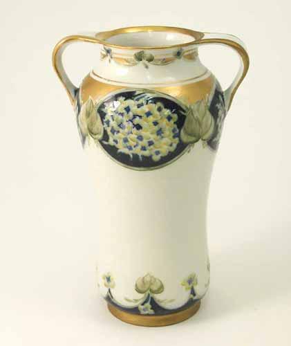 A Moorcroft for Macintyre 'Lilac' vase, twin-handled and decorated in shades of blue, green and yellow against a white ground with gilt highlights, c.1905-1913, painted signature and printed mark for Rushworths, 9.25ins £300-500
