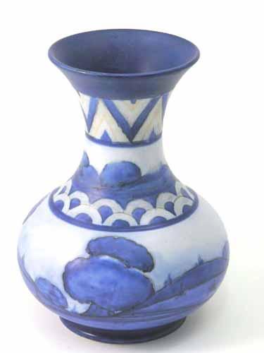 A Moorcroft saltglaze 'Dawn Landscape' vase, decorated in shades of blue and yellow with chevron and scale bands, painted signature and impressed marks, 7.75ins £600-800