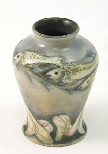 A Moorcroft saltglaze fish vase, decorated with an encircling pattern in shades of blue, green and pink, c.1928 impressed marks, 3.5ins £650-750
