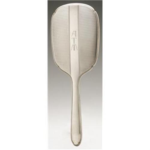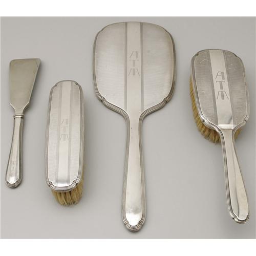 <B>An American Silver Vanity Set</B></I><BR><B>H. R. Morss & Co., North Attleboro, MA; and R. Blackington & Co., North Attleboro, MA, Twentieth Century</B></I><BR><BR>Comprising an H. R. Morss & Co. hand mirror and hair brush; an Blackington & Co. clothes brush and unknown shoe horn, all monogrammed with <I>ATM</B></I><BR>The mirror: 12.3in. long x 4.2in. wide