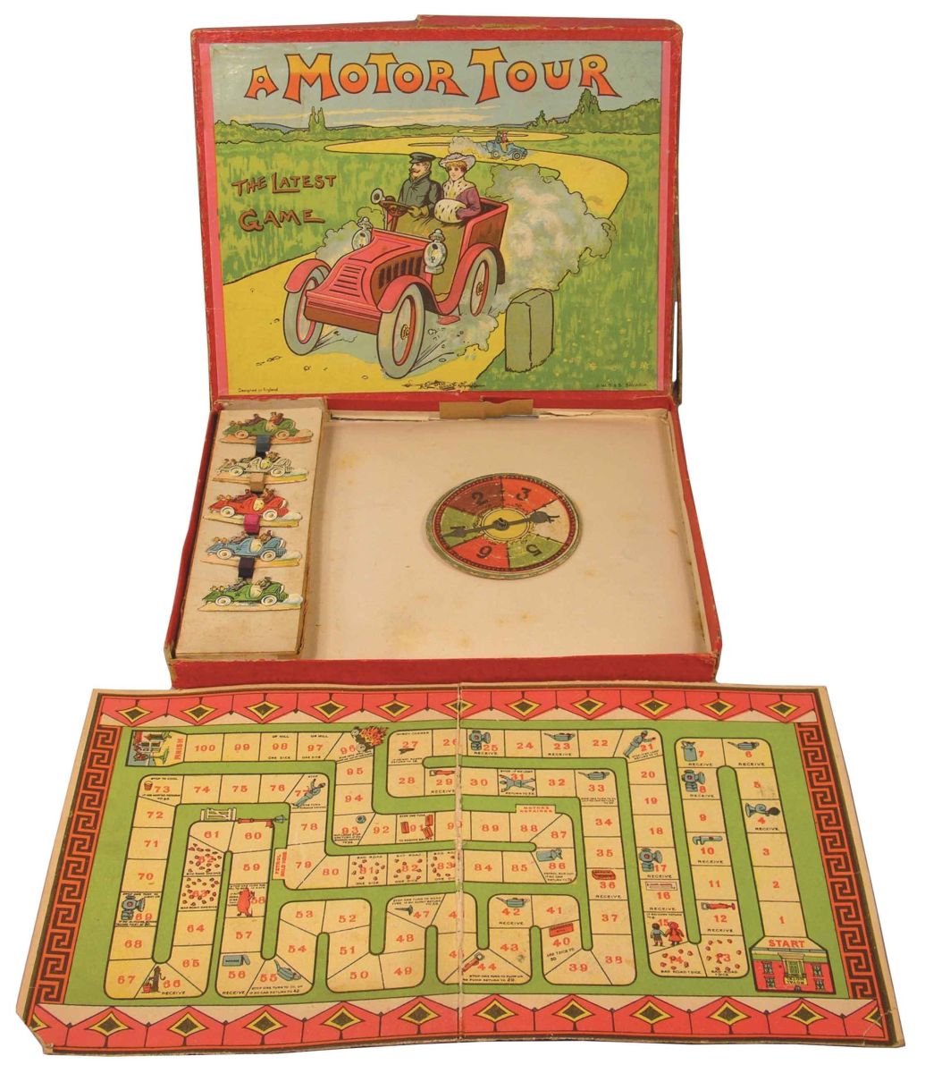 A Motor Tour Board Game, designed in England. J.S & S Bavaria maker. Instructions on inside of lid. Some damage to edges of box otherwise excellent condition. 11 X 9 X 1 inches closed. Start Price $40