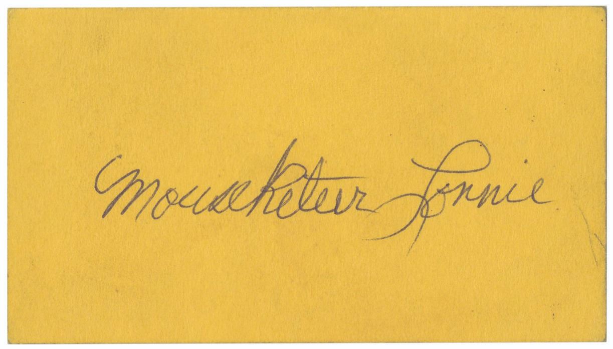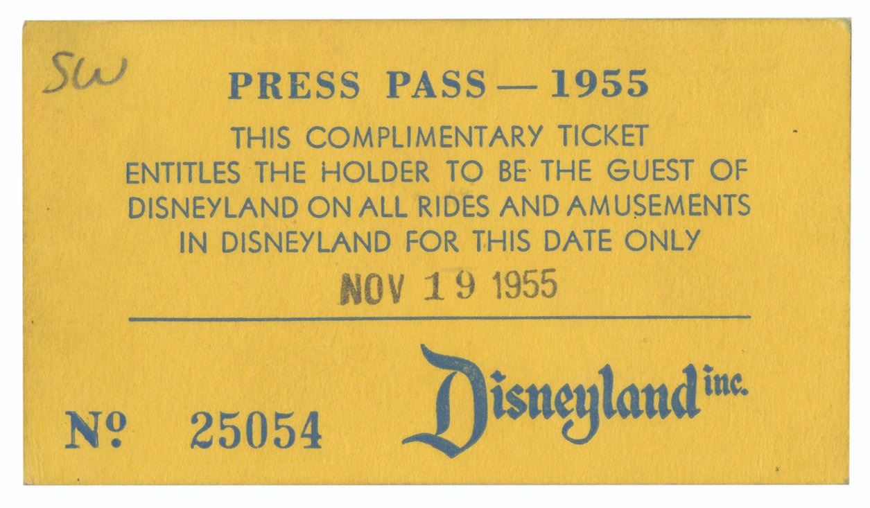 (Disneyland, 1955) A rare complimentary press pass ticket from 1955. This ticket entitled the holder to enjoy all rides and amusements in Disneyland and was stamped on November 19, 1955. The ticket is numbered 25054. The front has the initials 'SW' written in pencil in the top-left corner, and the back of the ticket is signed by Mouseketeer Lonnie in pen. The ticket measures 2.25" x 4" and is in very good condition with light edge wear and slight discoloration from age.
