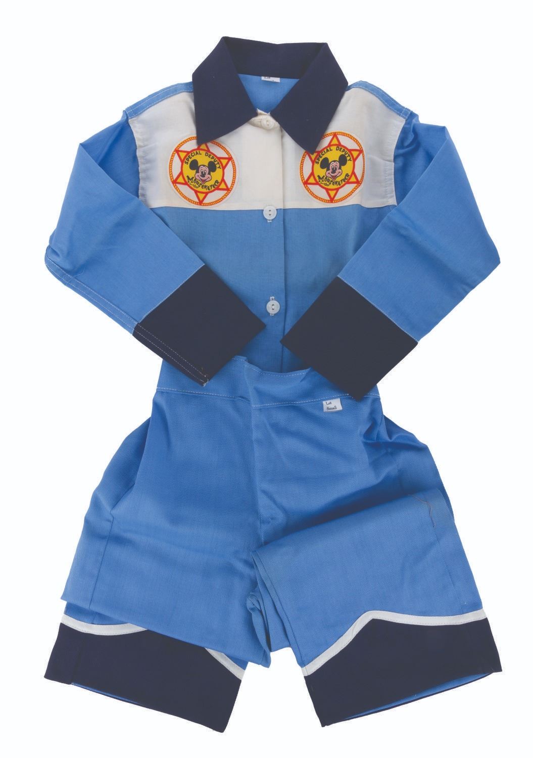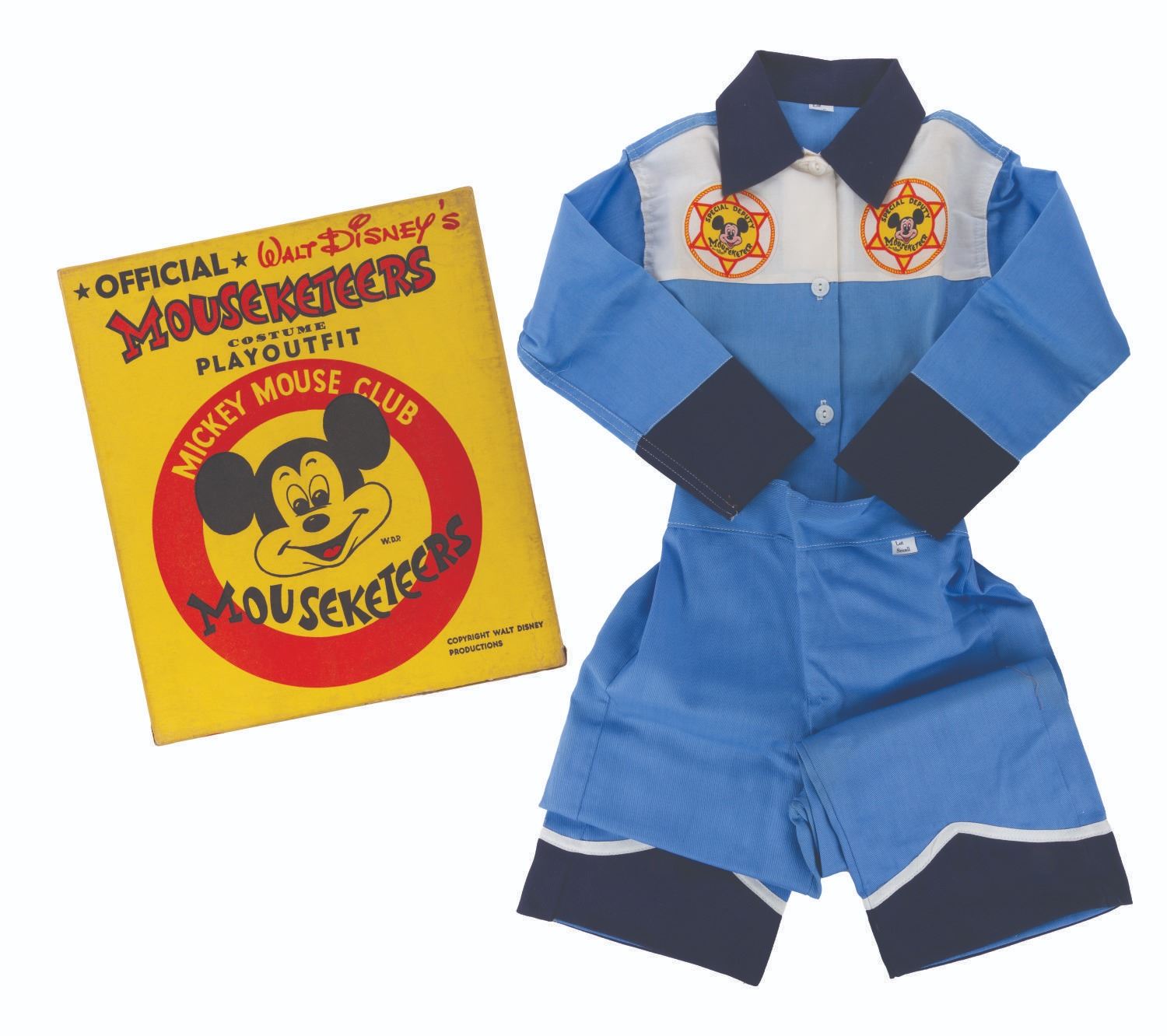 (Disney, 1950s) An official Walt Disney's Mouseketeers Costume Playoutfit set in the original packaging, manufactured by Ben Cooper. The set includes a special deputy shirt, matching pants, a ram horn belt buckle, and a white cloth belt. Measuring a toddler size small, the set is in very good condition with light discoloration on the shirt from being stored folded. The box is in good condition with wear from use, including some tears along the edge and a vintage tape repair.
