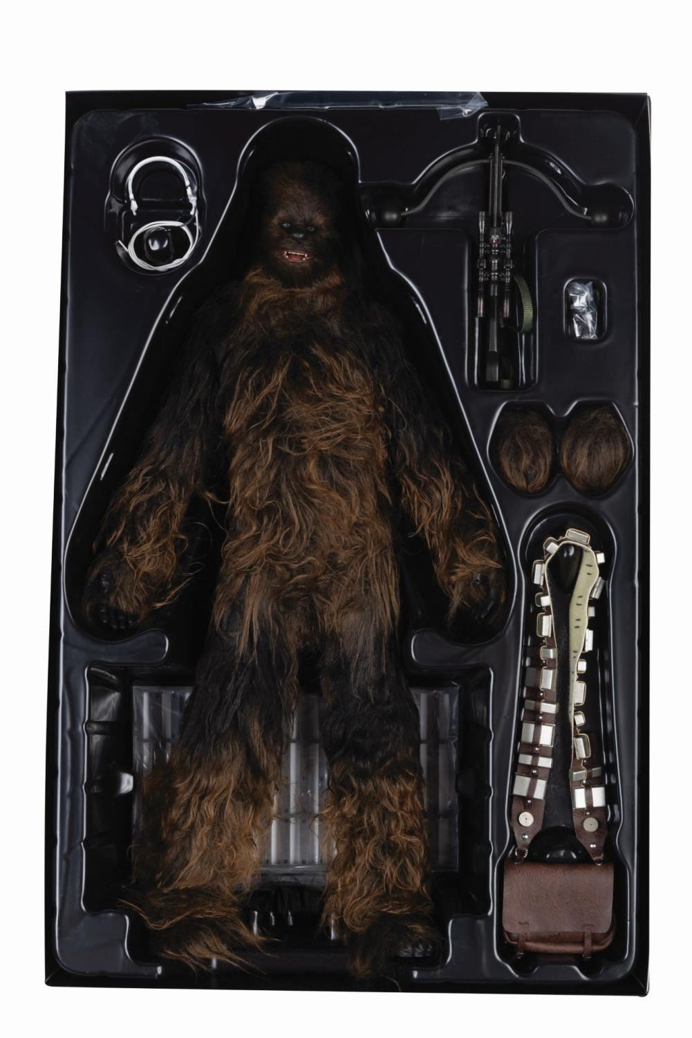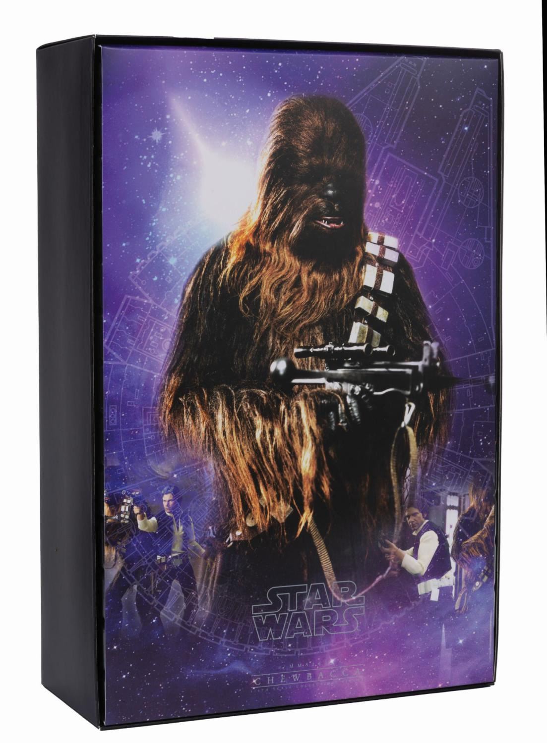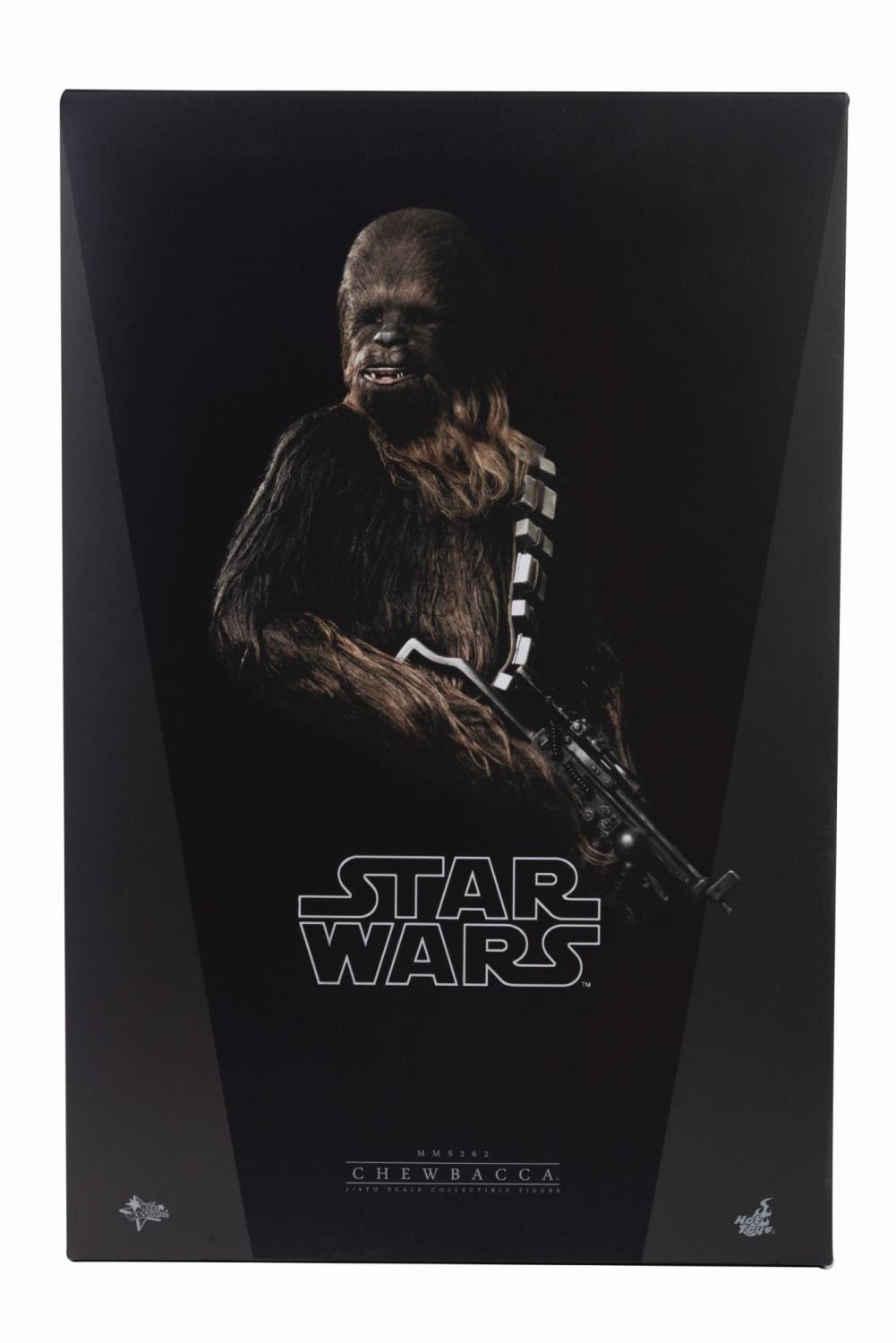 (Lucasfilm/Hot Toys Ltd., 2015) A Movie Masterpiece Series Star Wars Chewbacca 1/6th Scale Collectible Figure by Hot Toys. The complete figure (MMS262) features more than 30 points of articulation. This likeness of the wookiee as he appeared in "Star Wars Episode IV: A New Hope" comes with (2) extra hands, headset, bandolier, removable ammo, bowcaster, figure stand, nameplate, brush, and instructions. Measuring 14" tall and 6" at its widest, the figure is in fine, as-new condition in original packaging and 16"x10.75"x4.75" box.
