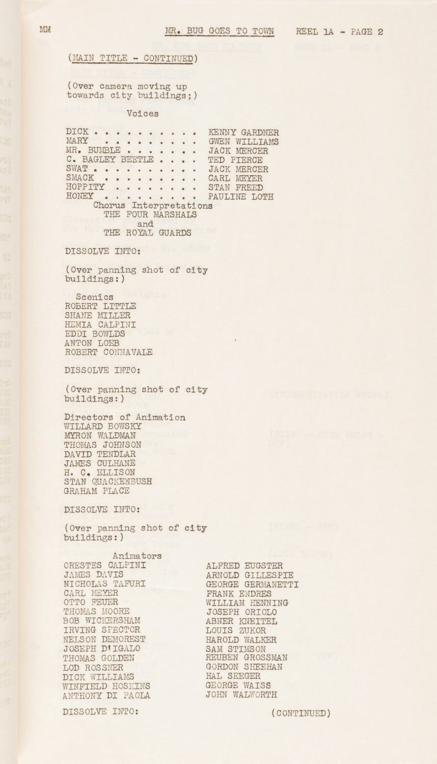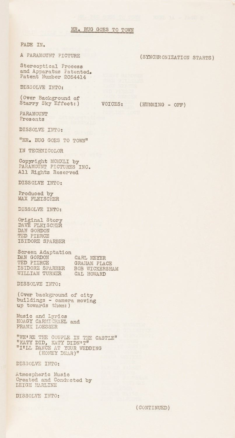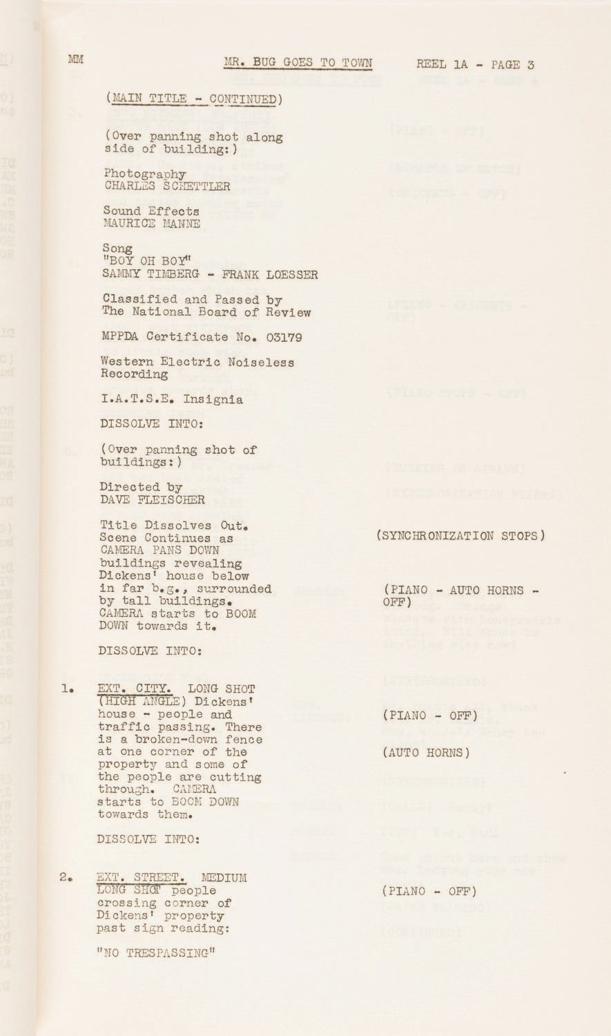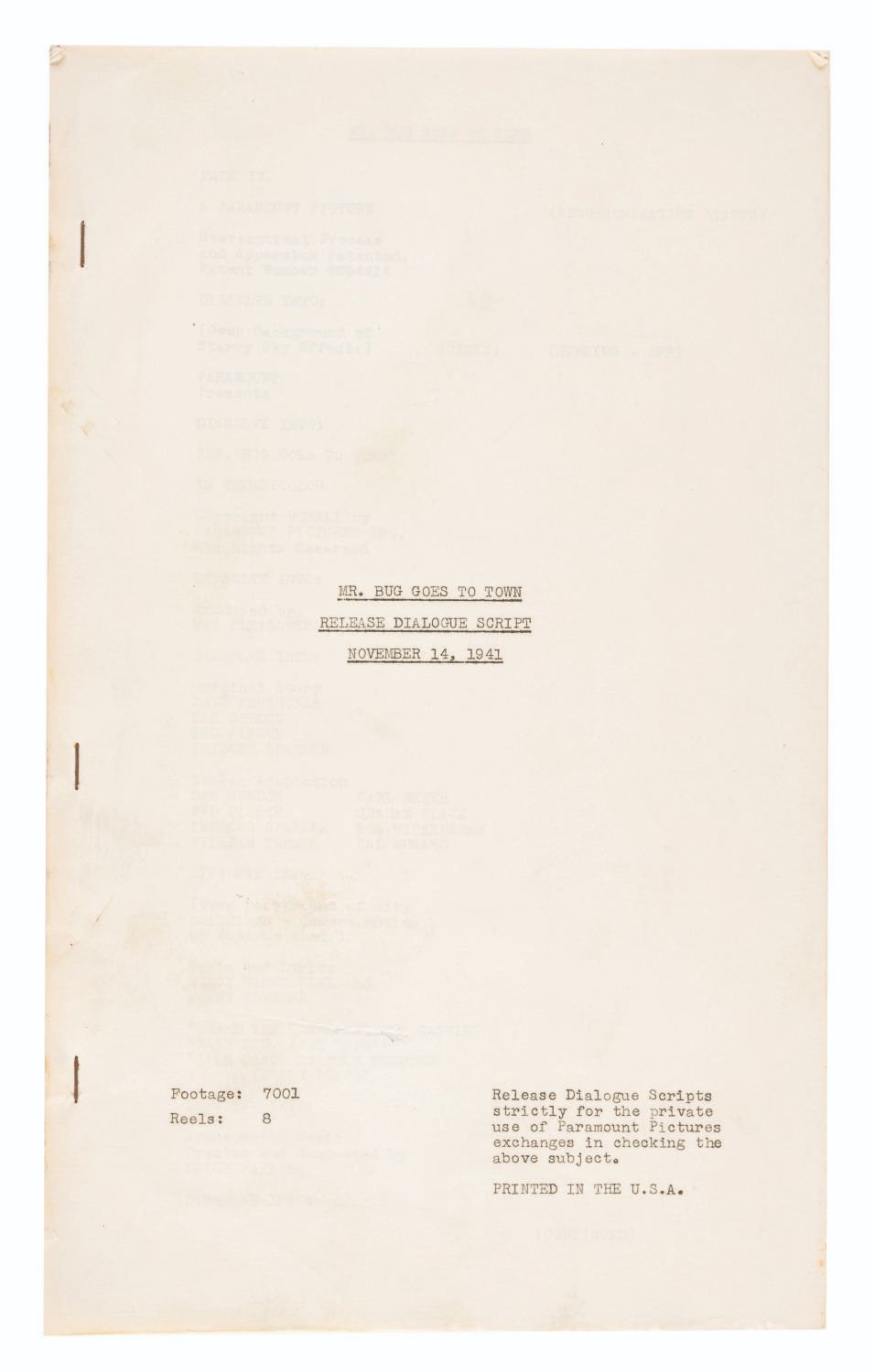 (Paramount, 1941) A release dialogue script for “Mr. Bug Goes to Town,” the second animated feature film produced by Fleischer Studios. This type of script is used in post-production to track all shots, dialogue, and sound in a film. Measuring 8.5” x 14”, the script is in good condition with scratches, scuffs, discoloration from age, and wear from production use. Fleischer Studios was a pioneering and influential animation studio founded 1929 by the Fleischer brothers Max and Dave. The studio was responsible for the creation of cartoon greats like Koko the Clown, Bimbo, Superman’s first animated appearance, and their biggest box office stars, Betty Boop and the animated version of Popeye the Sailor. Despite the studio’s eventual acquisition by its distributor, Paramount Pictures, and restructuring to the formation of Famous Studios, the characters they created continue to delight modern audiences to this day.