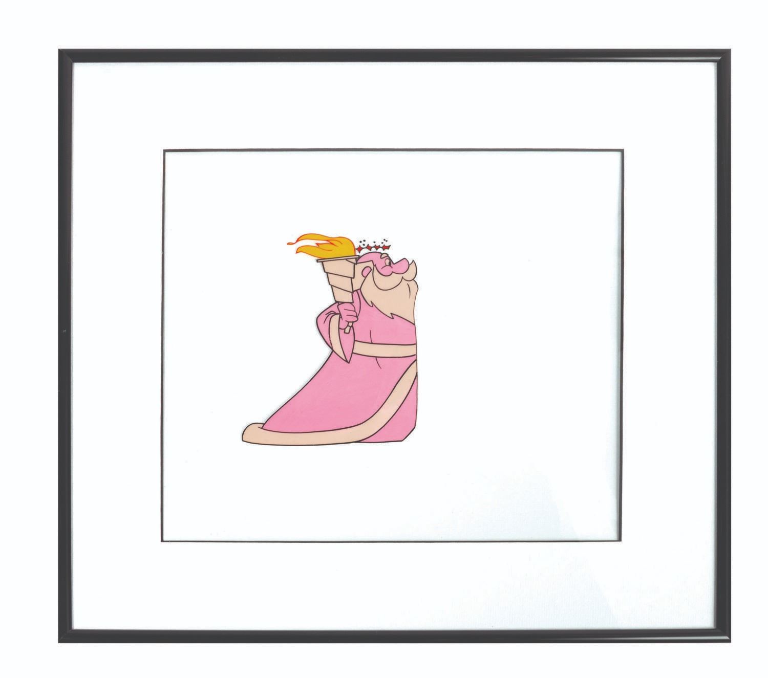 (UPA, 1962) An original production cel of the Ghost of Christmas Present from"Mr. Magoo’s Christmas Carol." The cel has an image size of 5.5" x 4.25" within its 15.25" x 16.25" frame. The artwork has not been examined out of frame, but appears to be in very good condition with a couple of small cracks in the paint of the robe.