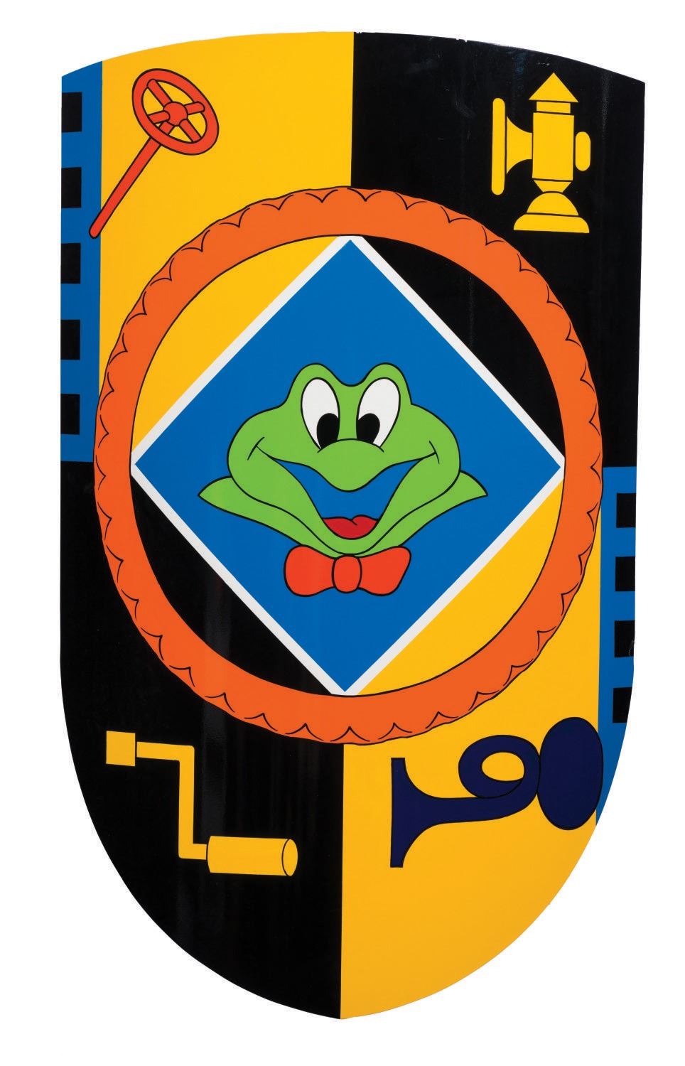 (Disneyland) An amazing reproduction of crest-shaped sign from "Mr. Toad's Wild Ride" attraction in Fantasyland at Disneyland. The sign features motorcar parts among the heraldic imagery and was custom made as a decorative piece for Joel Magee. Measuring 48"x29" and approximately 5" in depth, the large metal shield sign displays in fine condition, with vibrant color palette.