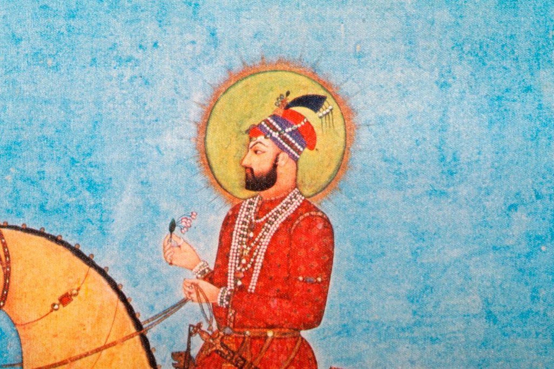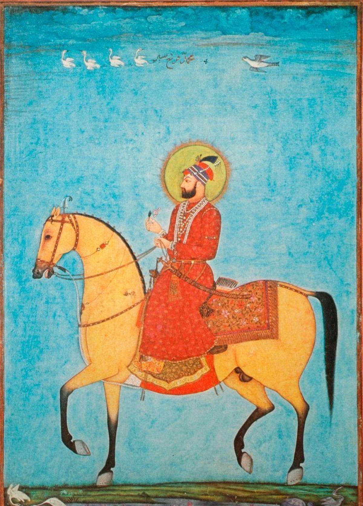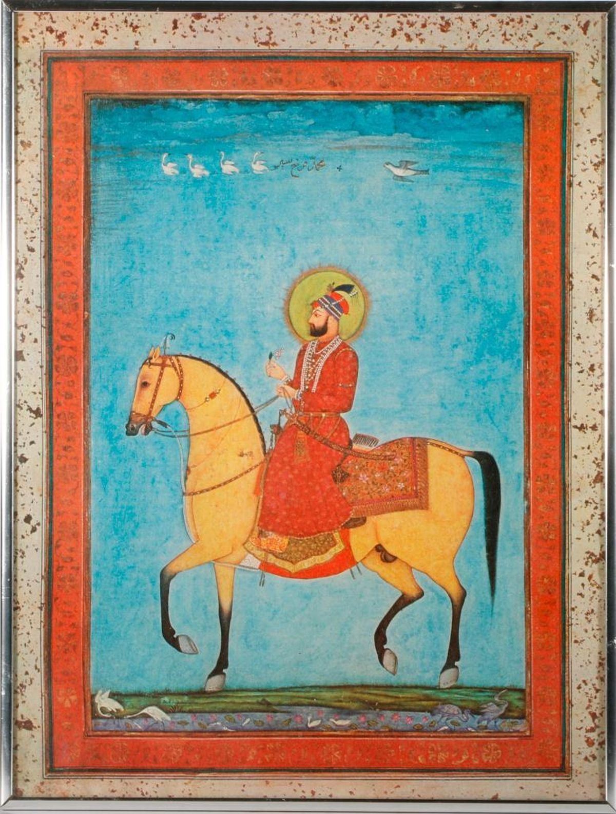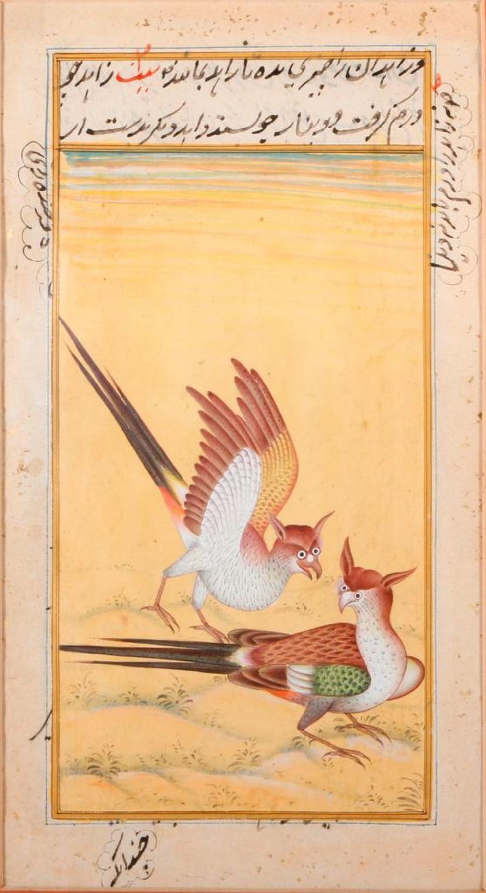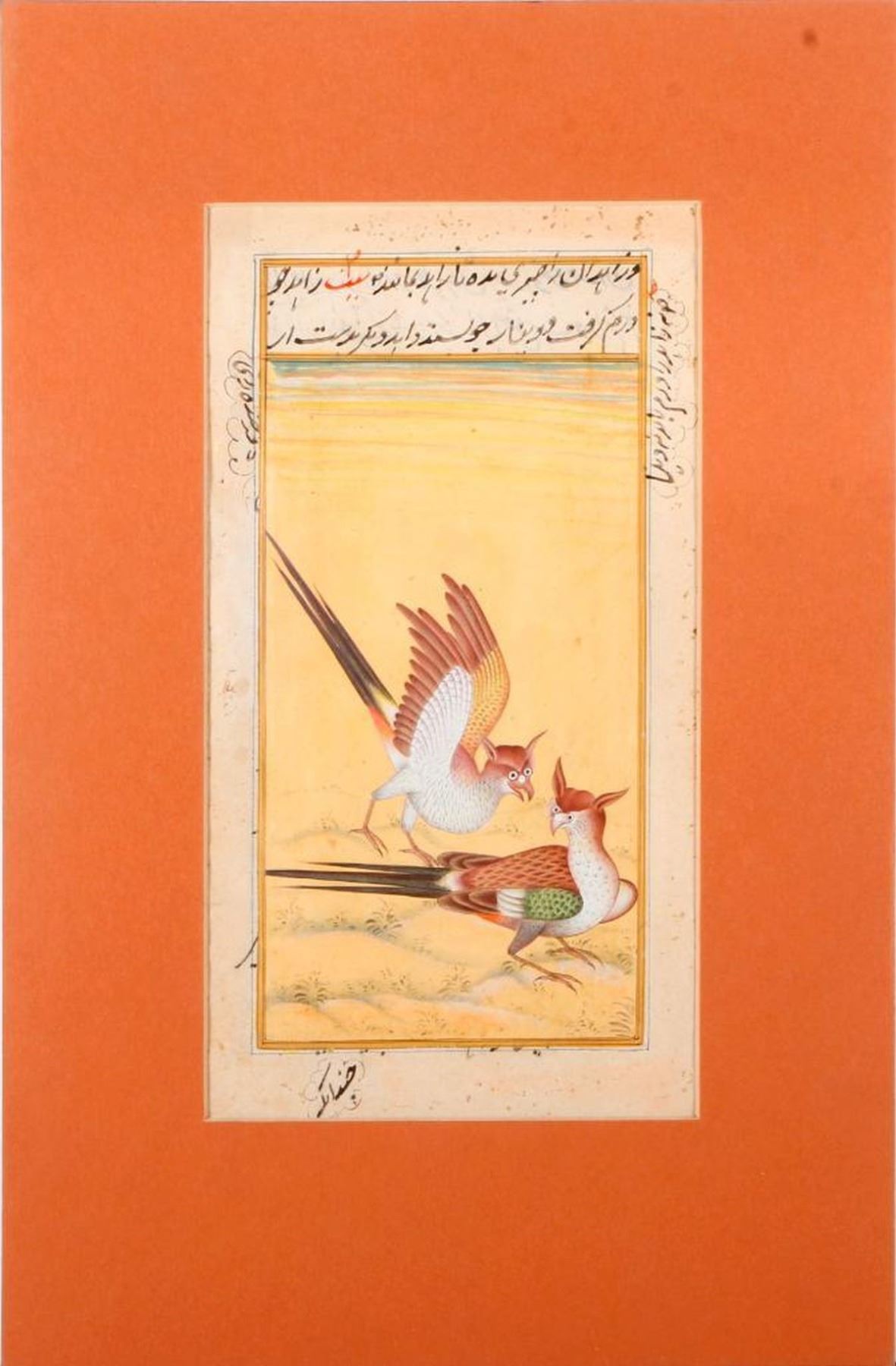 An 18th century Mughal painting of birds. Image measures 9 1/2 inches high x 5. Matte measures 13 3/4 inches high x 9. A 20th century framed print of a Mughal painting measuring 17 1/2 inches high 13 1/4. Condition: Good.