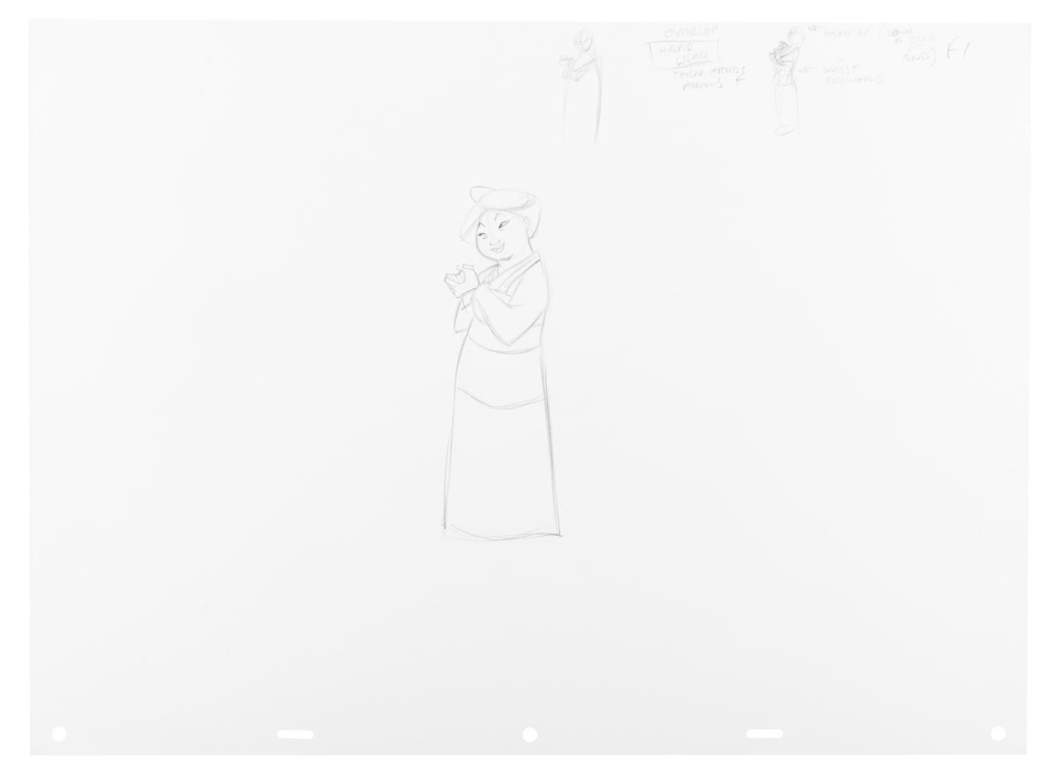 (Disney, 1998) An original production drawing of Hua Li, Mulan’s mom, from Disney’s “Mulan.” Hua Li has an image size of 6” x 2.25” on 12.5” x 17” animation paper. The graphite drawing is in very good condition with light creasing to the edges from production use.