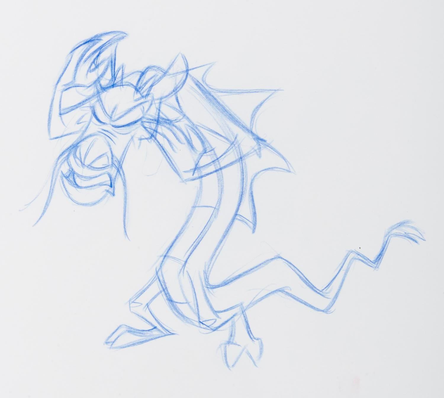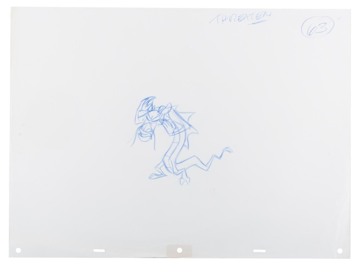 (Disney, 1998) An original production drawing of Mushu the dragon from “Mulan.” Mushu has an image size of 4.75” x 5.5” on 12.5” x 17” animation paper. The colored pencil drawing is in very good condition with moderate creasing.
