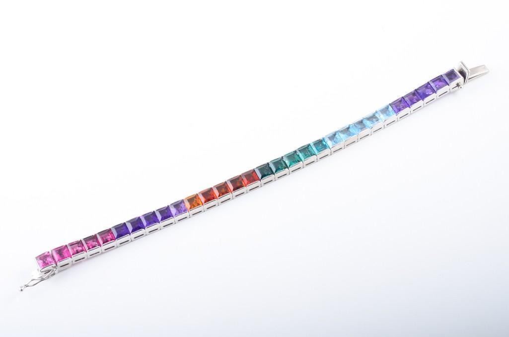 18K white gold rainbow colored stone line bracelet with amethyst, aquamarine, tourmaline, citrine. Bracelet length 6 inches, width 1/4 inches, weight 25.2g.
