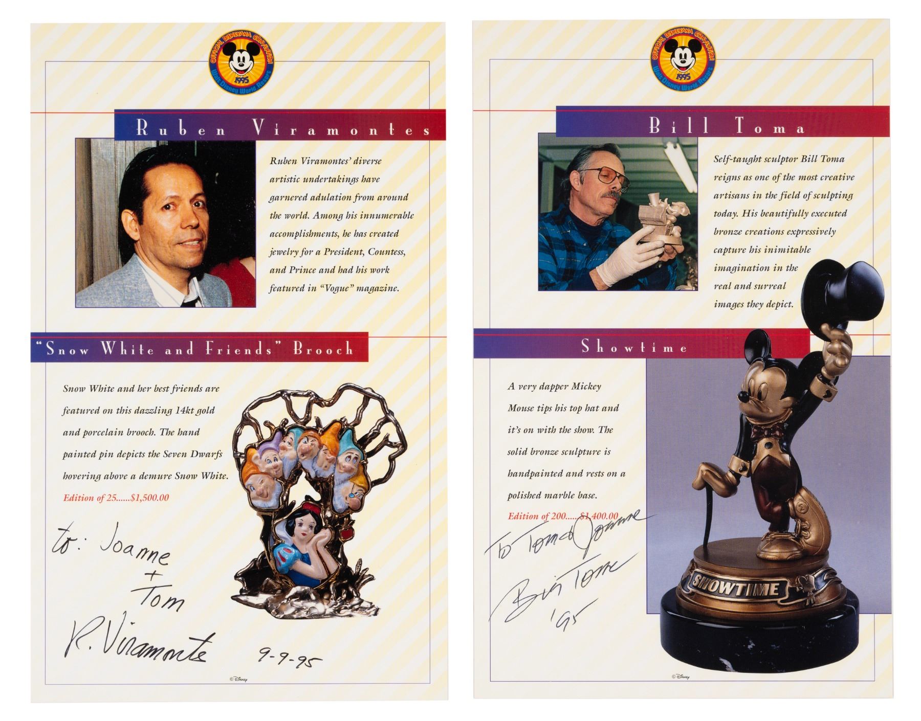 (Disneyana, 1995) A Disneyana Convention Limited Edition merchandise catalog from 1995 with 15 designer’s signatures. The looseleaf catalog includes a page for each Limited Edition lithograph, figure, or jewelry piece offered at the convention, and every page is signed by the designer. Signatures include film poster artist Drew Struzan, Bill Toma, Randy Souders, the Arribas Brothers, Giuseppe Armani, Ron Lee, two by Paul Vought, and more. Measuring 6.5" x 10.5", the signed catalog is overall in very good condition, with the outer folder showing some handling wear.