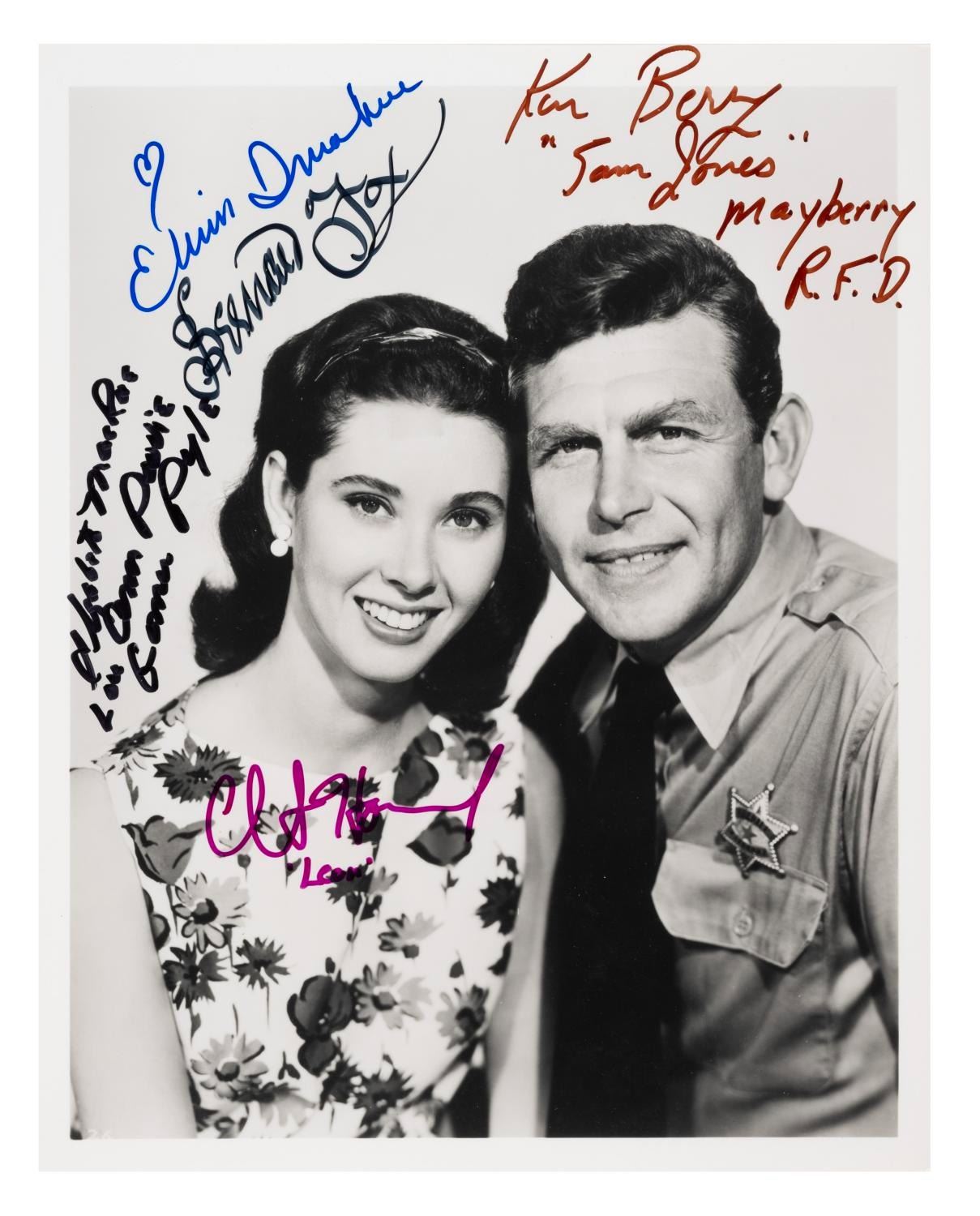 (CBS, 1980s-90s) A “The Andy Griffith Show” black and white publicity photo of Andy Griffith and Elinor Donahue, signed by five members of the show. The autographs include Donahue (Ellie Walker), Bernard Fox (Malcolm Merriweather), Elizabeth MacRae (Betty Parker), Clint Howard (Leon), and Ken Berry (Sam Jones). Measuring 8” x 10”, the signed photo is in very good condition with light scratches.