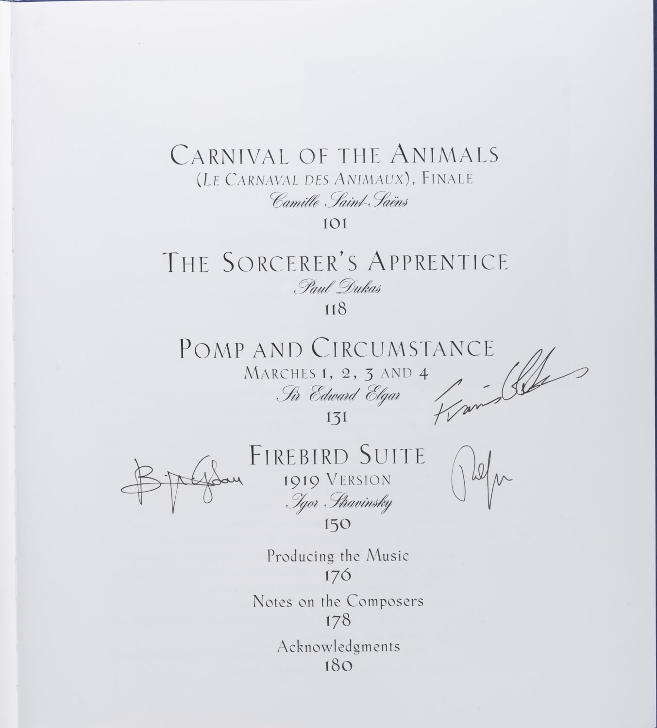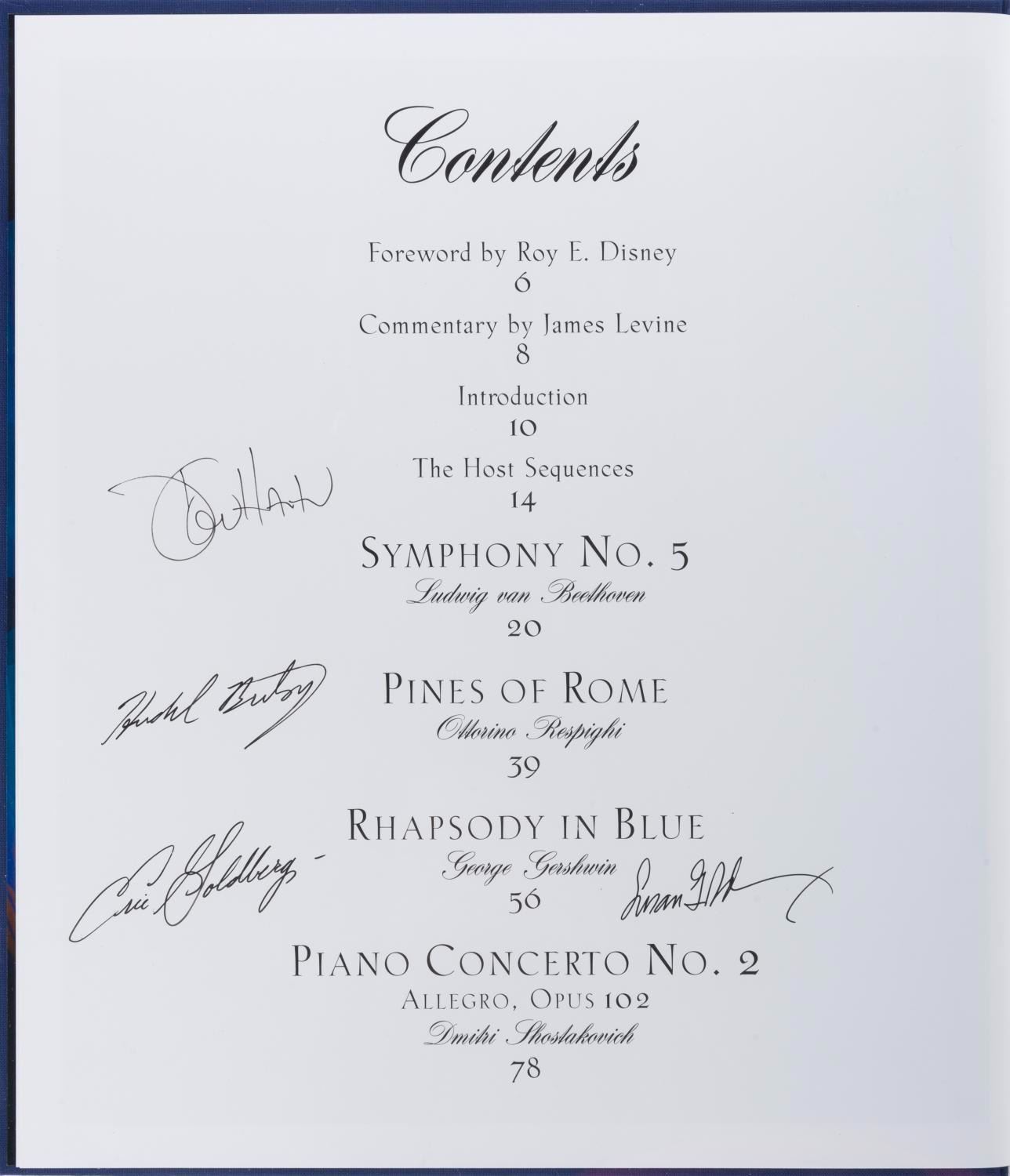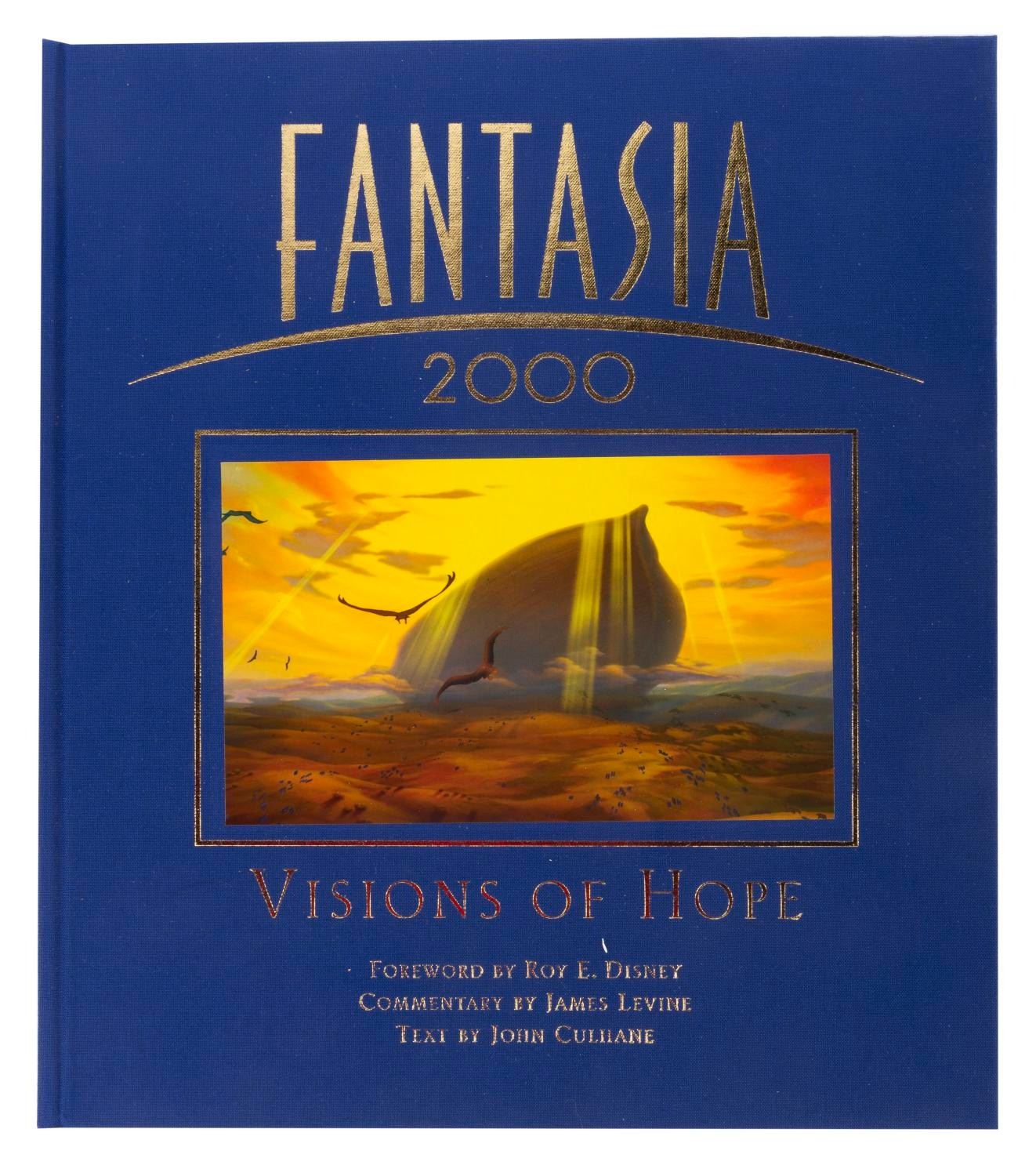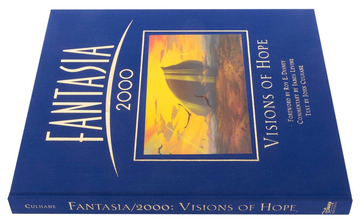 (Disney Editions, 1999) A Fantasia 2000: Visions of Hope hardback book signed by multiple creatives who brought the film to life. The 180-page book includes signatures from directors Eric Goldberg, Francis Glebas, Paul Brizzi, Gaetan Brizzi, Hendel Butoy, art director Susan Goldberg, and producer Don Hahn. Measuring 11.25” x 13”, the book is in very good condition with light scratches and handling wear, while the slipcover is in good condition with scratches, creases, scuffs, and wear.