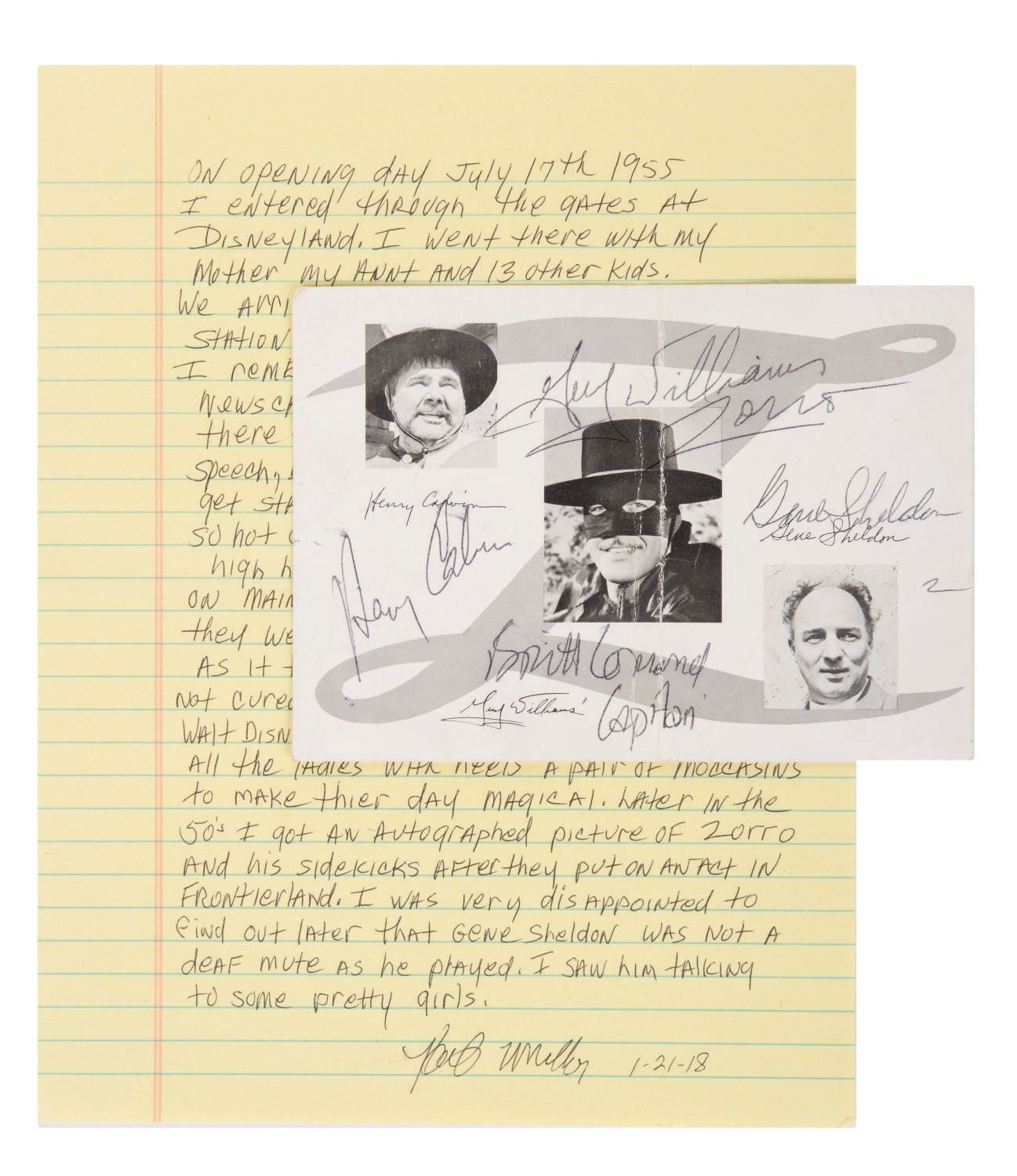 (Disneyland, 1950's) A fan card for Walt Disney's Zorro, signed by actors from the series including Guy Williams (Zorro), Henry Calvin (Sgt. Garcia), Gene Sheldon (Bernardo), and Britt Lomond (Capitan Monastario). The lot also includes a handwritten account from the man who attended the opening day ceremonies for Disneyland on July 17, 1955, and later received these autographs. Measuring 5"x7", the card displays well though in fair condition, with wear from handling and a heavy vertical crease from folding.