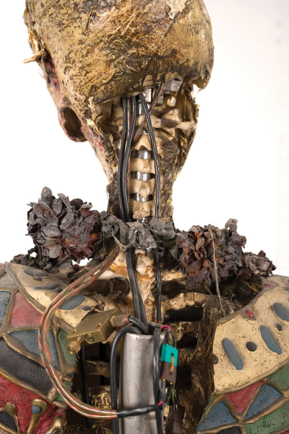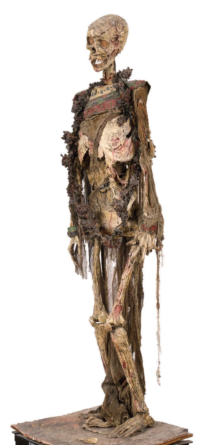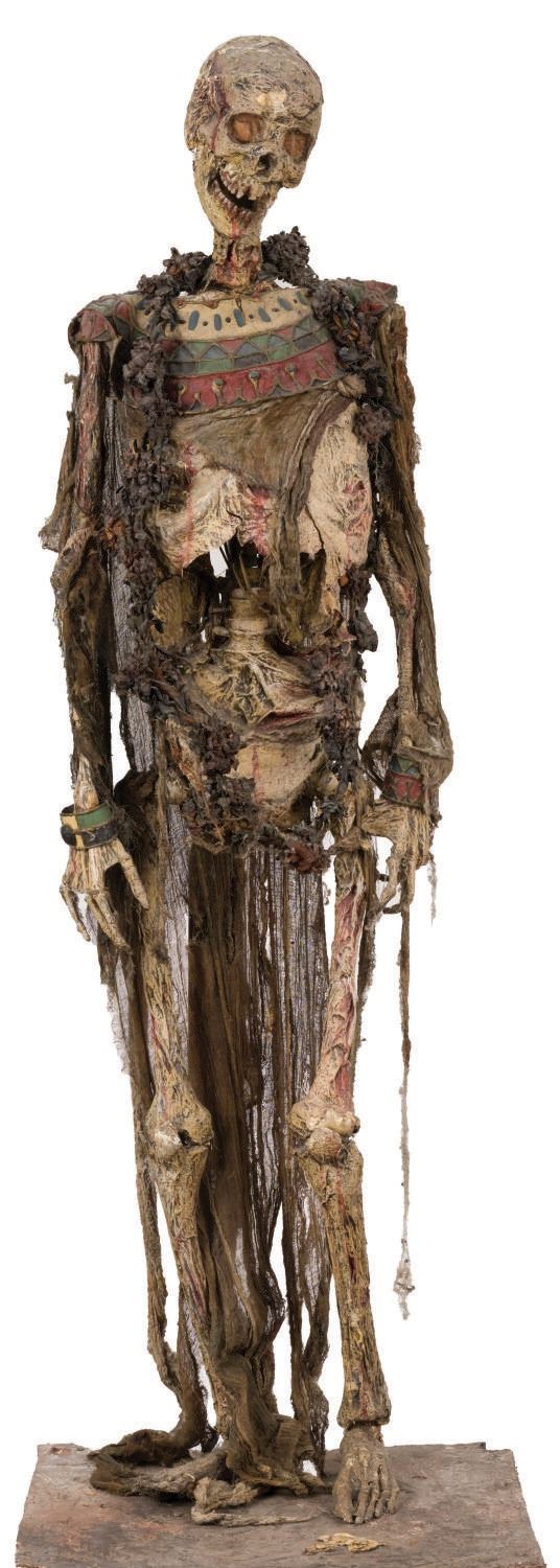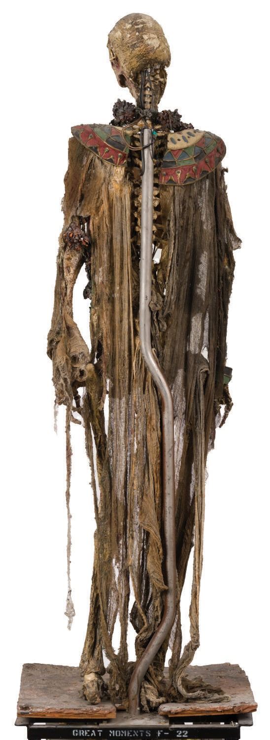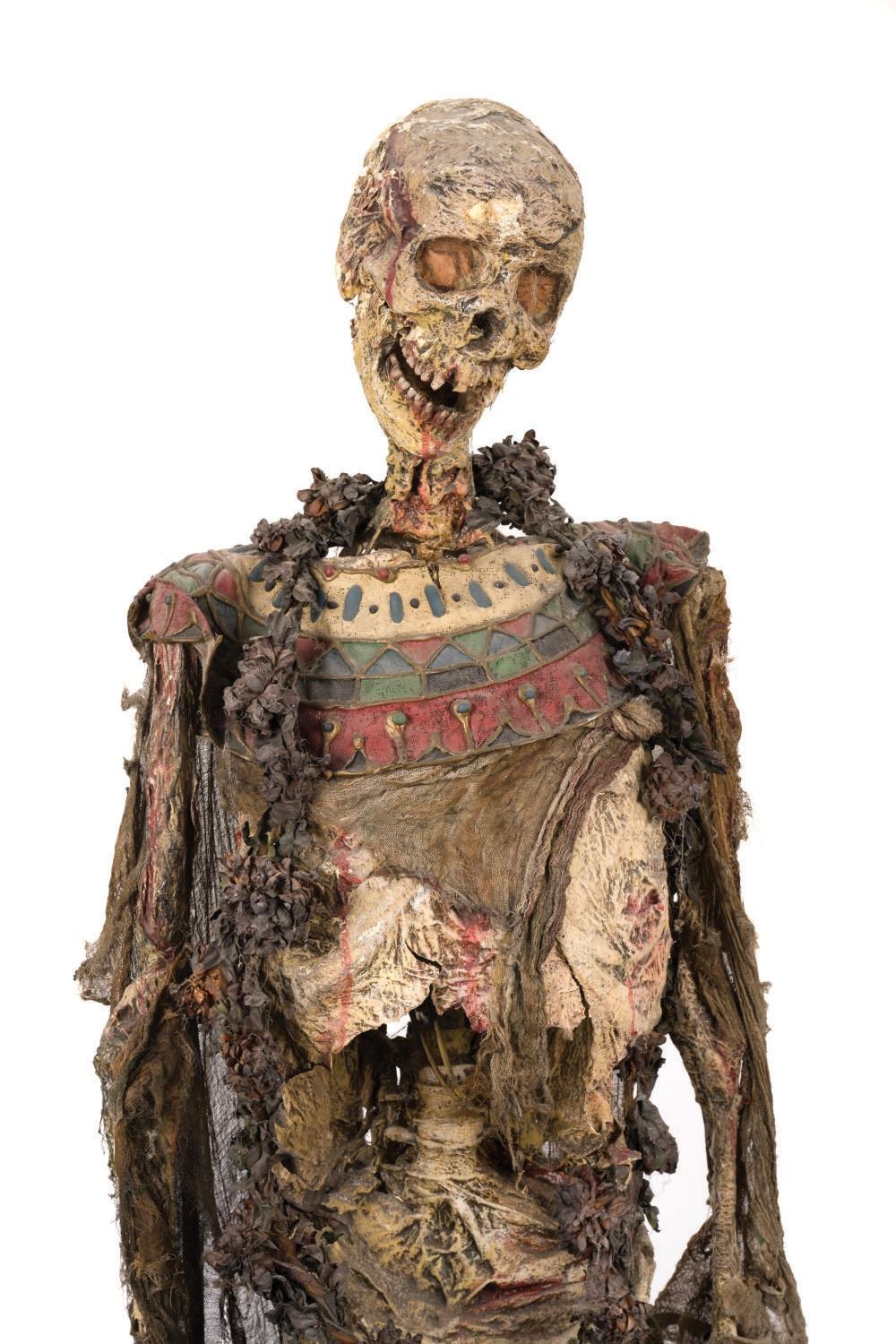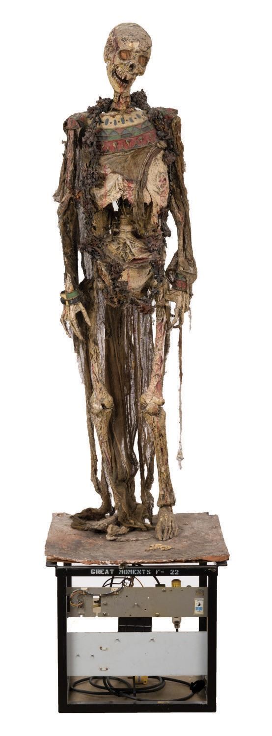 (Disney-MGM Studios, 1989) An animatronic mummy figure from the Egyptian Temple scene in The Great Movie Ride at Disney-MGM Studios. Of particular note, the base the figure is affixed to is labelled "Great Moments," indicating it was first used in one incarnation of Great Moments With Mr. Lincoln, the very first animatronic human attraction created by Walt Disney's Imagineers. The figure stands 70" tall atop the 21.25"x19.25"x18.25" high base, bringing the entire height of the piece to 88.25". Both the historic base and figure are in fine park-used condition, with intentional distress to the mummy.