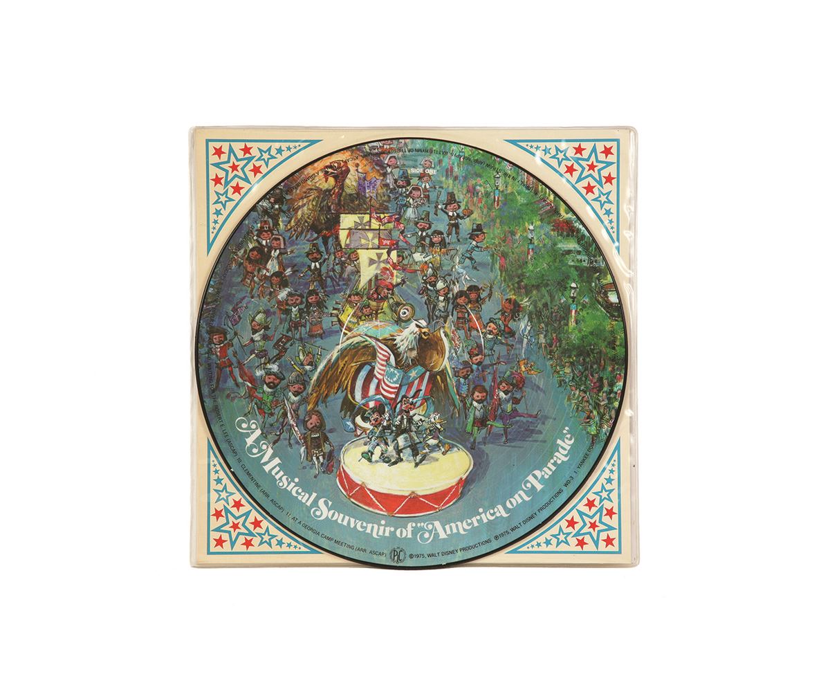 (Disneyland, 1975) A rare picture album with imagery of "America on Parade" on both sides of the vinyl, this album features songs from Disneyland and Walt Disney World's pageant. Cover is in good condition with little wear. Vinyl is in very good condition.