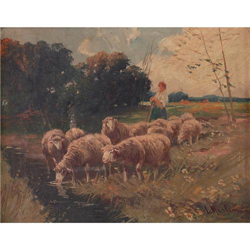 A. Muslinn (French School, 19th century), "Shepherdess", c. 1890; oil/canvas, 8" x 10", signed.