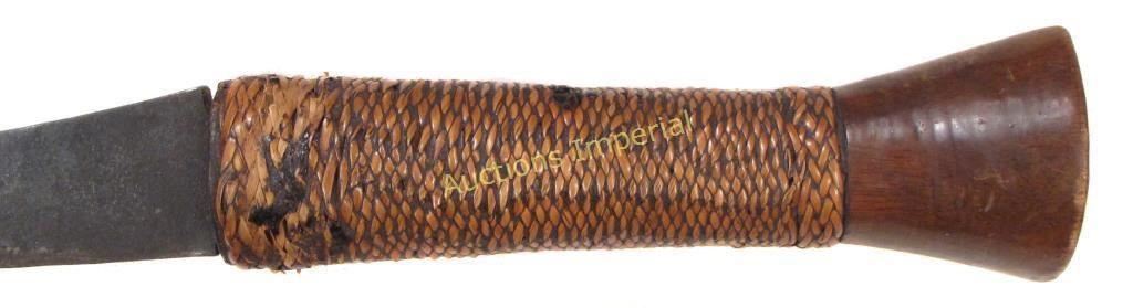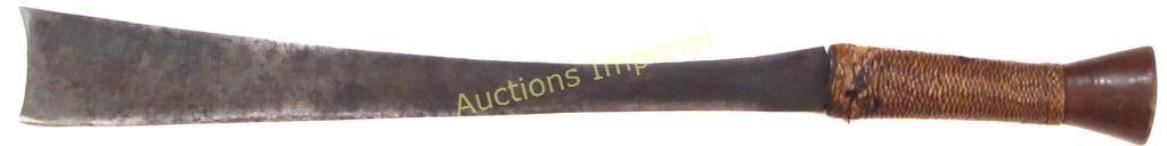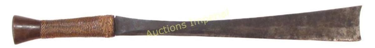 The wooden grip with flared pommel bound with fine rattan band. The handforged, single-edged blade with expanded tip and chisel edge. Latter 19th century. Light wear. Overall length 59 cm.