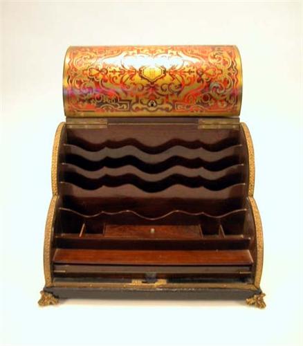 A NAPOLEON III BOULLE INLAID TABLE TOP WRITING DESK; French, the shaped hinged top opening to a rosewood interior fitted with compartments, wells and a retractable writing slide, all on cast ormolu feet, some repairs, 10 1/2"h x 14 1/4"w x 9"d