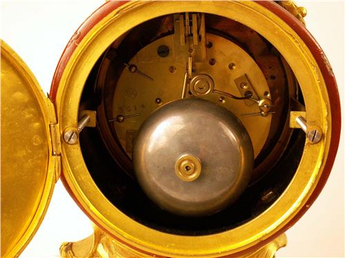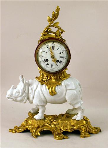 French, the works marked "AD Mougin/Duex Medailles," Some repaint to dial, repair to rear leg of rhinoceros, and tip of tail, pendulum inside body, 19 1/4"h x 6"w x 14"l